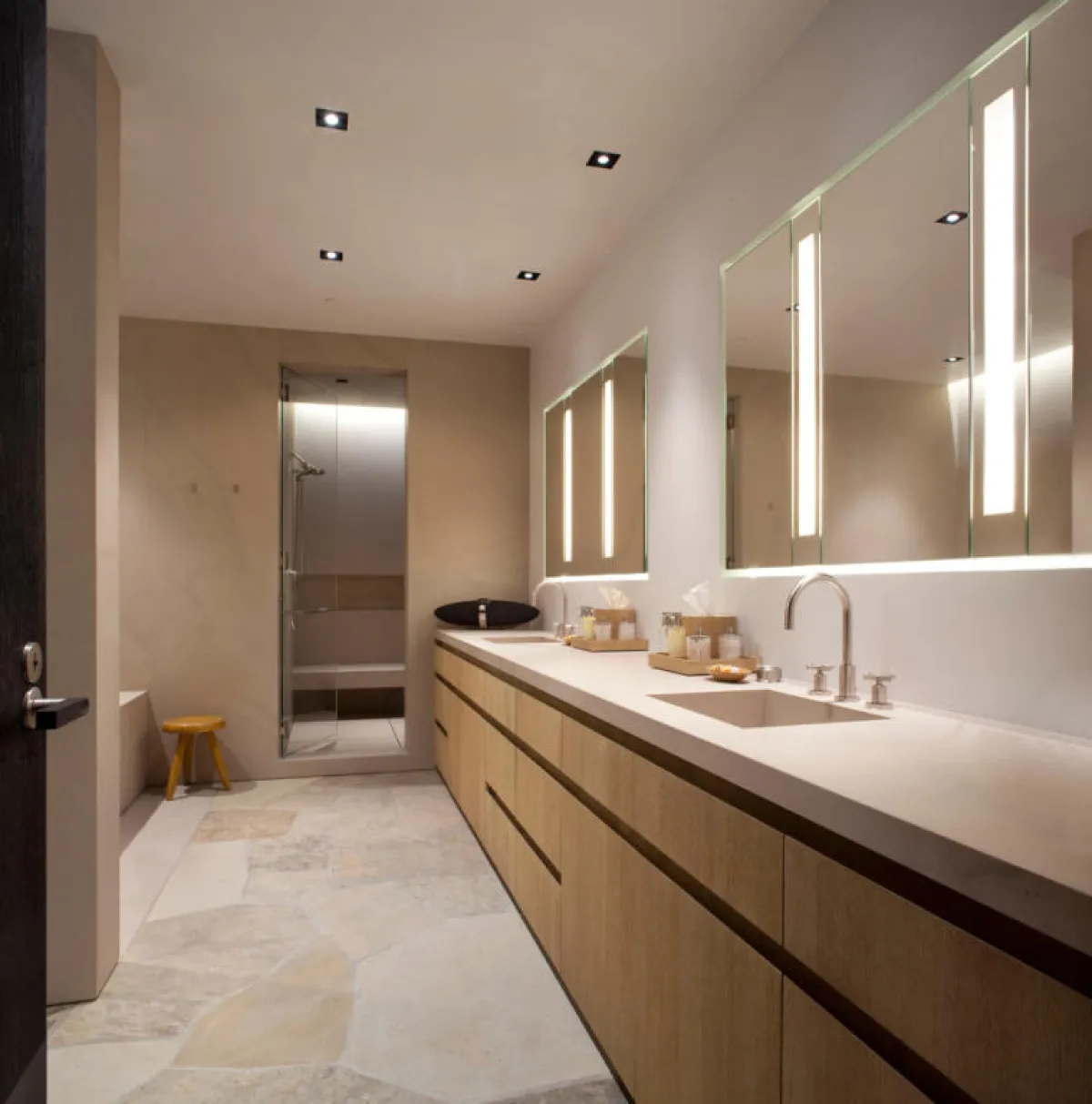 5. الحمام: تكون الإنارة المجاورة للمرآة عالية، بسبب طبيعة الاستخدام، بحيث يتكرَّر النظر إلى الوجه، مع تجنب "السبوت لايت" فوق الرأس، تلافيًا لتكوُّن ظلال عالية. ويمكن الاستعاضة عن هذه الأخيرة بوضع إنارة أماميَّة إما فوق المرآة أو بجانبها أو خلفها.
