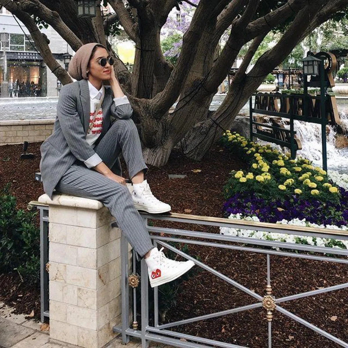 سالي عاشور ظهرت بصورة على حسابها الخاص في انستقرام، بالتوربان البيج مع البدلة الكاجوال الرمادية اللون.
