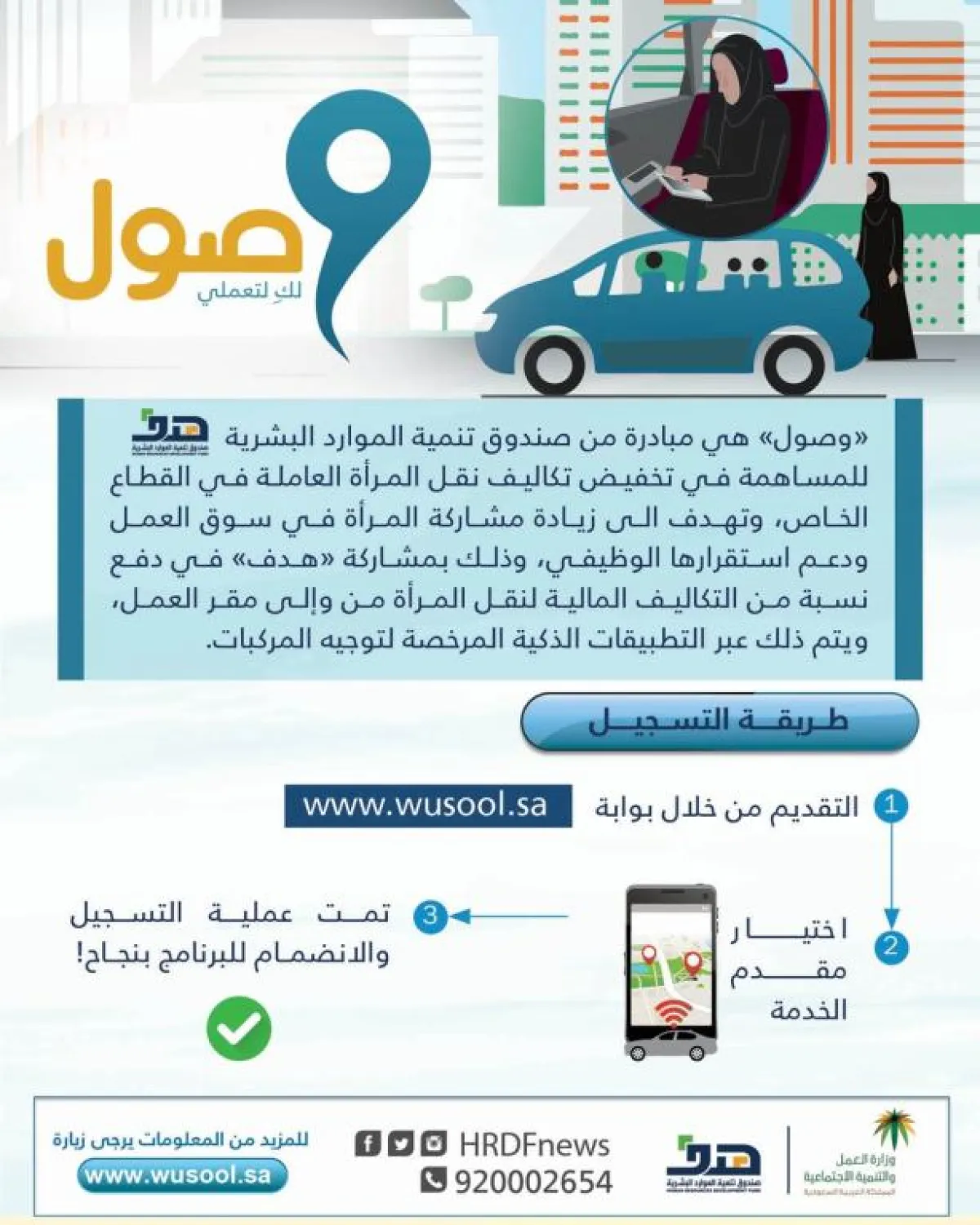 وقال المتحدث الرسمي لوزارة العمل والتنمية الاجتماعية وصندوق تنمية الموارد البشرية "هدف" خالد أبا الخيل: إن برنامج "وصول" يأتي بوصفه أحد الحلول لمعالجة تحديات التنقل من وإلى مقر العمل من خلال تأمين خدمة المواصلات بشكل آمن وذي جودة وسلامة عاليتين. وأشار إلى أن البرنامج يشترط أن تكون الموظفة مسجَّلة في نظام المؤسسة العامة للتأمينات الاجتماعية. بحسب الوكالات.