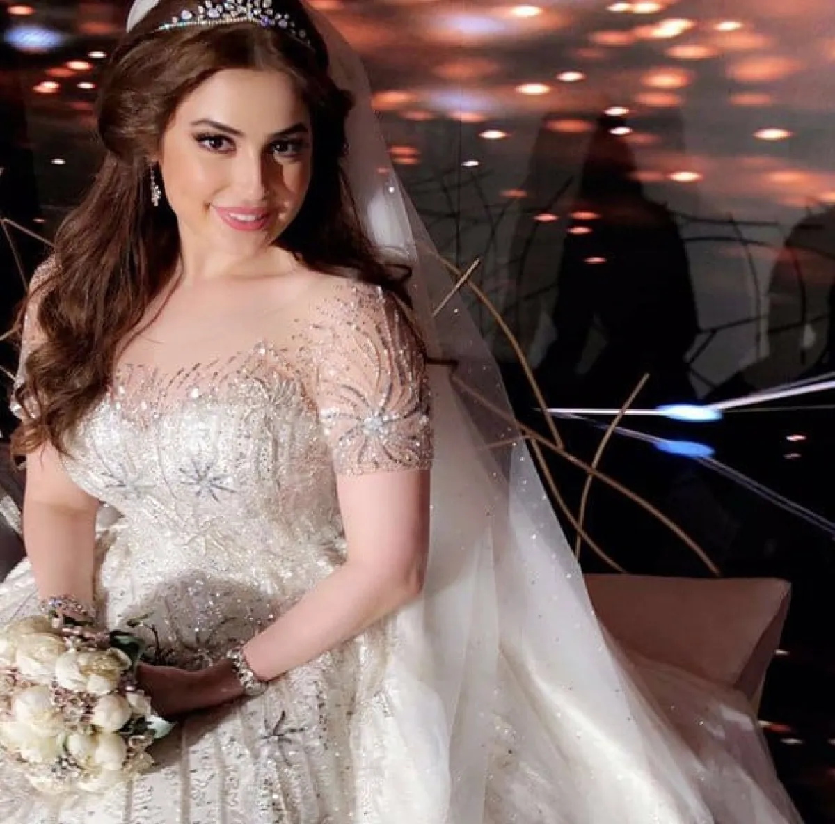 أما الإطلالة الثانية فقد تميزت بأناقة الفستان وتطريزاته البرّاقة، وأضافت العروس التاج الضخم لتسريحتها، وقد نالت هذه الاطلالة إعجاب الحاضرين.