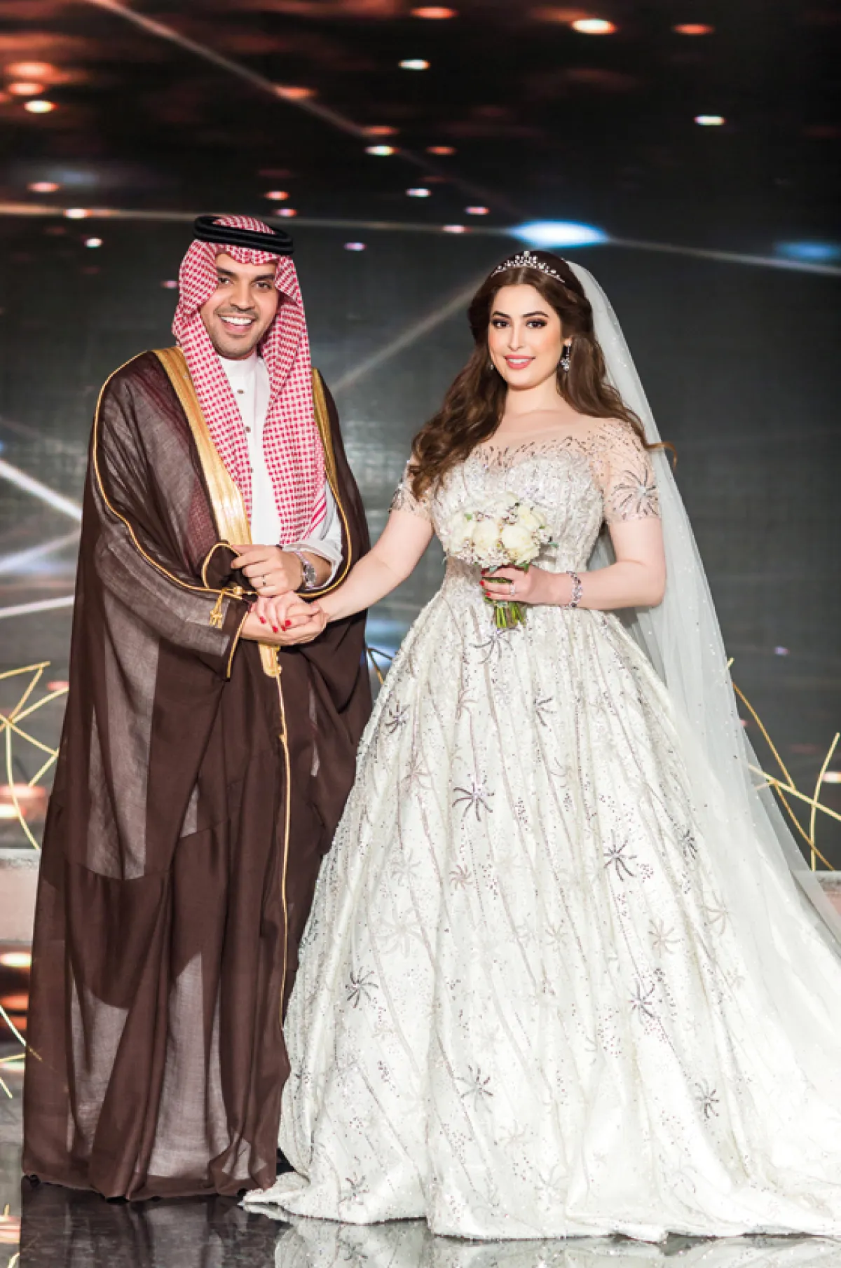 أطلّت العروس العنود الحربي بفستاني زفاف، الأول من تصميم همسة الصوفي، تميز بتطريزاته الفخمة وتصميمه المحتشم ذي الأكمام الطويلة، وأضافت إليه الطرحة المطرزة.