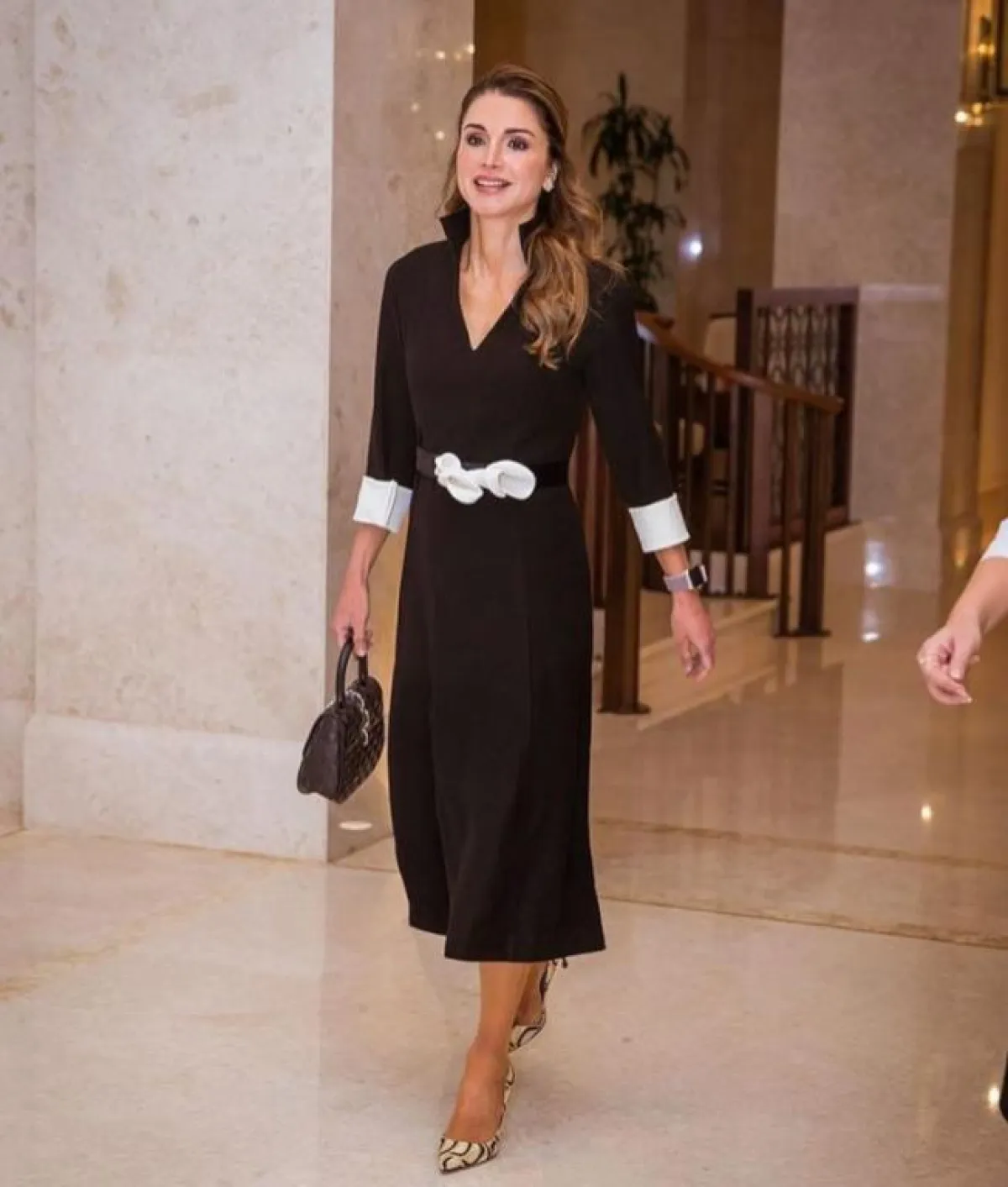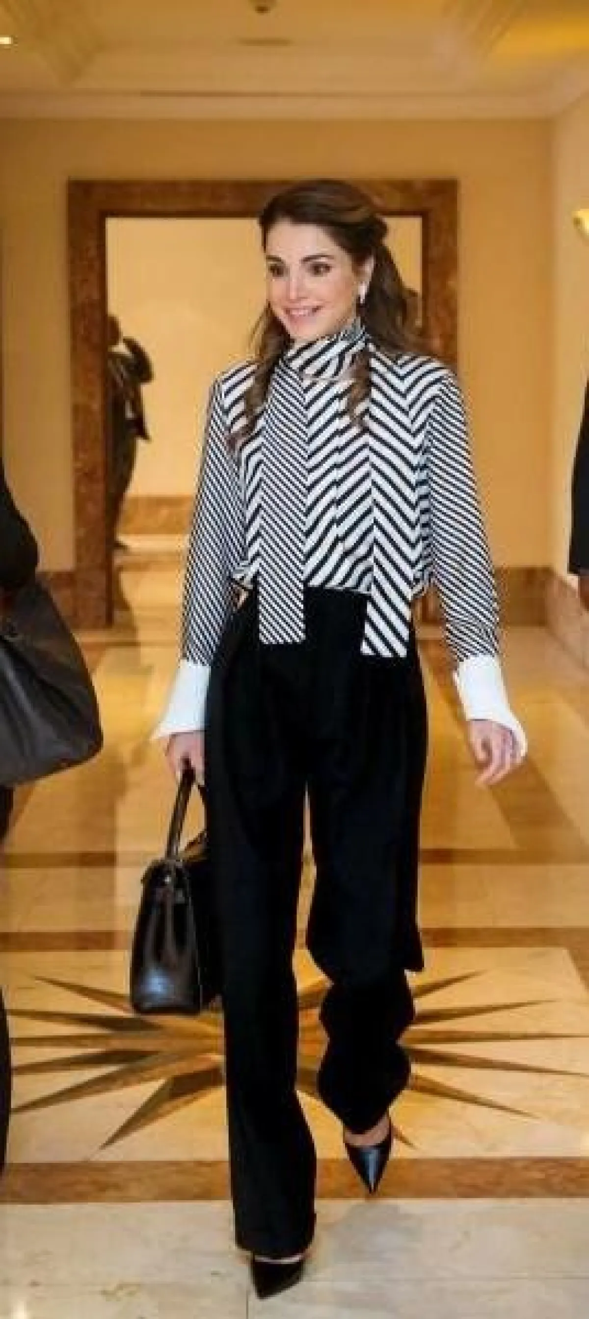 تلجأ الملكة رانيا عادة للأزياء المصممة بتقليمات رأسية رفيعة مما يكسبها المزيد من الطول مثل الفستان المونوكروم من لويفي Loewe، والبلوزة الأنيقة التي نسقتها مع بنطال أسود عالي الخصر من Monse