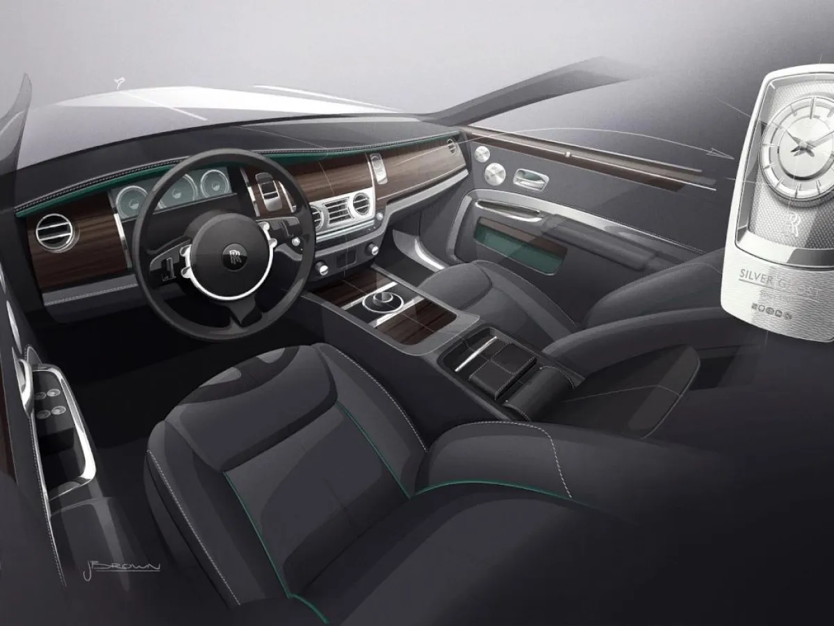 في الداخل، تكتسي المقاعد بالجلد الأخضر، على غرار الطراز التاريخي. كما تظهر بطانة الأبواب مكسوَّة بجلود بلون الفضَّة. وتتحلَّى الأبواب ببعض القطع الفضيَّة الخالصة، كساعة تتوسَّط لوحة القيادة، عليها نحت "سيلفر غوست منذ سنة 1907".