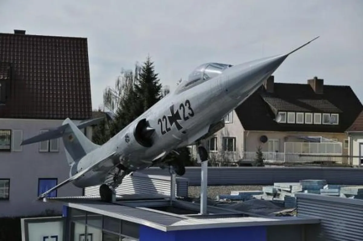 في الوقت الذي يحاول فيه العالم إعادة السلام إلى الأرض، ونشر العبارات المنادية بالأمن والأمان. قام رجل أعمال ألماني يدعى هارتموت ريهورش بشراء طائرة مقاتلة حربية من طراز F- 104 في صفقة مع سلاح الجو الألماني بلغت قيمتها 100 ألف جنيه إسترليني أي ما يعادل 571 ألف ريال سعودي، ويبلغ وزنها نحو 4 أطنان، فقط ليقوم بوضعها على سطح مصنعه ليعبر بذلك عن مدى قوة وصلابة منتجاته، وقد استغرقت عملية تركيبها ما يقارب 16 ساعة متواصلة بعمل 800 عامل. وبحسب ما نشرته صحيفة مترو البريطانية أنّ سكان الحي احتجوا على الفكرة وحاولوا إبطالها وإزالة الطائرة بتبليغ الجهات المسؤولة إلا أنّ جميع شكواهم تبعثرت في الهواء نظراً لاستيفاء صاحب المصنع جميع الموافقات اللازمة من السلطات.