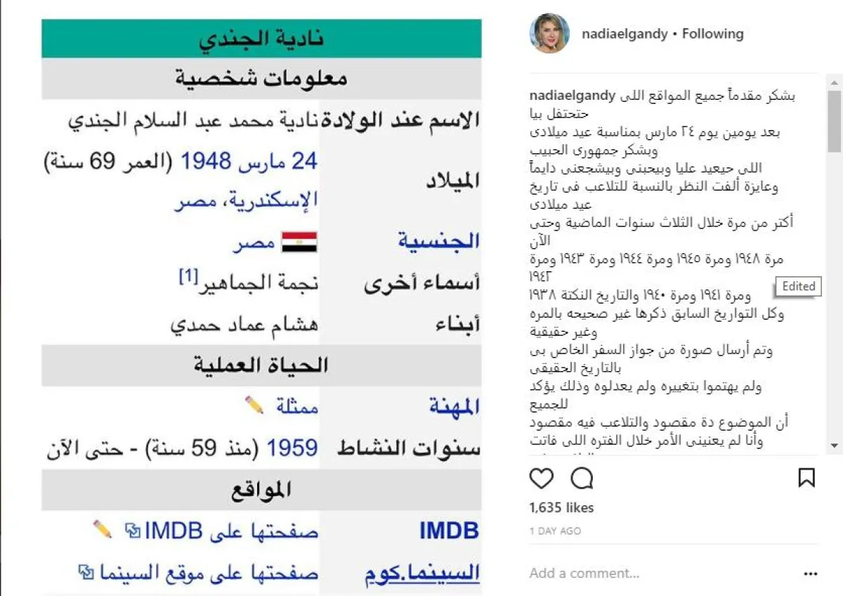 وقالت: يوم ٢٤ مارس عيد ميلادى وبشكر جمهوري الحبيب اللي هيعيد عليا وبيحبني وبيشجعني دايمًا وعايزة ألفت النظر بالنسبة للتلاعب في تاريخ عيد ميلادي أكتر من مرة خلال الثلاث سنوات الماضية حتى الآن، مرة ١٩٤٨ ومرة ١٩٤٥ ومرة ١٩٤٤ ومرة ١٩٤٣ ومرة ١٩٤٢ ومرة ١٩٤١ ومرة ١٩٤٠ والتاريخ النكتة ١٩٣٨ وكل التواريخ السابق ذكرها غير صحيحه بالمرة وغير حقيقية وتم إرسال صورة من جواز السفر الخاص بي بالتاريخ الحقيقي ولم يهتموا بتغييره ولم يعدلوه، وذلك يؤكد للجميع أن الموضوع ده مقصود والتلاعب فيه مقصود.