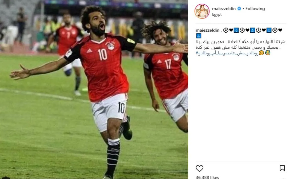 النجمة مي عز الدين، افتتحت باقة المنشورات حول تألق اللاعب المصري محمد صلاح أمام المنتخب البرتغالي، ونشرت عبر صفحتها الشخصية بموقع إنستقرام صورة للاعب وعلقت قائلة: شرفتنا النهارده يا أبو مكة كالعادة، فخورين بيك ربنا يحميك ويحمي منتخبنا كله.