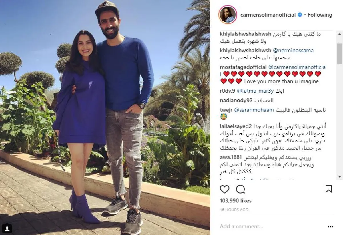الفنانة كارمن سليمان، وقعت في مصيدة انتقادات الجمهور لملابسها، بعدما نشرت للمرة الأولى عبر حسابها بموقع إنستقرام صورة لها برفقة زوجها مصطفى جاد وهي ترتدي فستانا أزرق قصيرا جدا، وعاتبها عدد كبير من جمهورها ووجهوا سهام النقد لزوجها، وتدخلت معجبة تدعى ايمان العباسي لإصلاح الأمور، حيث كتبت: يا كارمن متزعليش دا اكبر دليل انك محترمه وان جمهورك بيحبك بصدق ومش بيجاملوكي ومش متقبل منك ان الشهرة تغيرك انتي جميله وسيمبل ومحترمه واتحبيتي جدا عشان كدا متزعليش ابدا بليز بحبك كتير، فيما كتبت مشيرة: مش دى أخلاقك ع فكره، وعلقت أخرى: نسيت تلبس البنطلون.