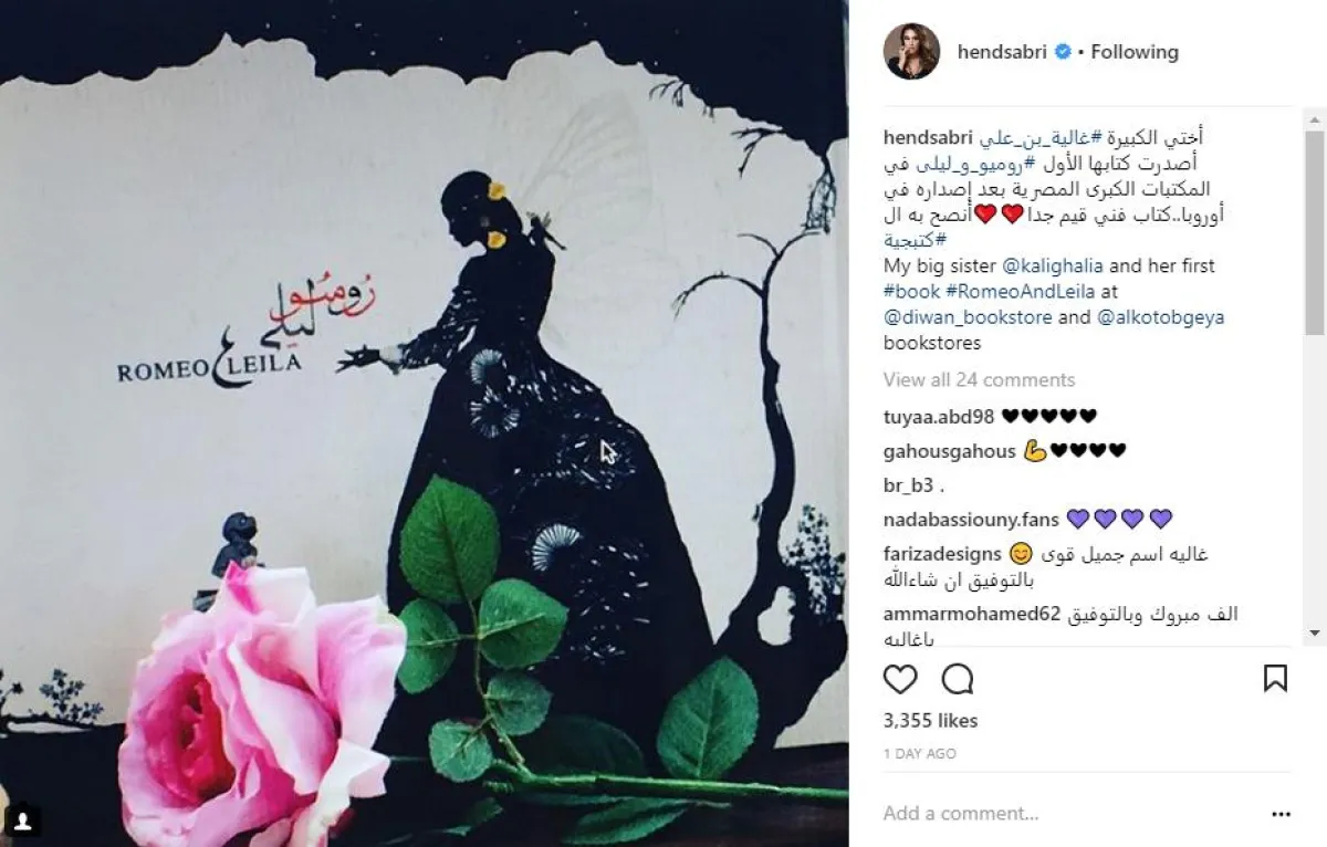 الفنانة التونسية هند صبري، هنأت صديقتها المُطربة غالية بن علي، عبر حسابها بموقع إنستقرام بمناسبة صدور الطبعة العربية من كتابها "روميو وليلى" ونشرت هند صورة لغلاف الكتاب الجديد، وعلقت عليها: أختي الكبيرة غالية بن علي، أصدرت كتابها الأول روميو وليلى، في المكتبات الكبرى المصرية، بعد إصداره في أوروبا .. كتاب فني قيم جدًا.