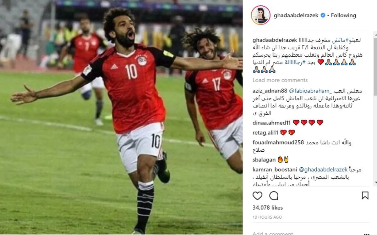 الفنانة غادة عبد الرازق شاركت نفس الصورة أيضا عبر إنستقرام أيضا، ولكنها قررت مواساة لاعبي المنتخب المصري بعد هزيمتهم في الدقائق الأخيرة، وعلقت قائلة:لعبتو ماتش مشرف جداااااا وكفاية ان النتيجة ٢/١ قريب جدا ان شاء الله هنروح كاس العالم ونغلب معظمهم ربنا يحرسكم بجد رجااااالة مصر ام الدنيا.