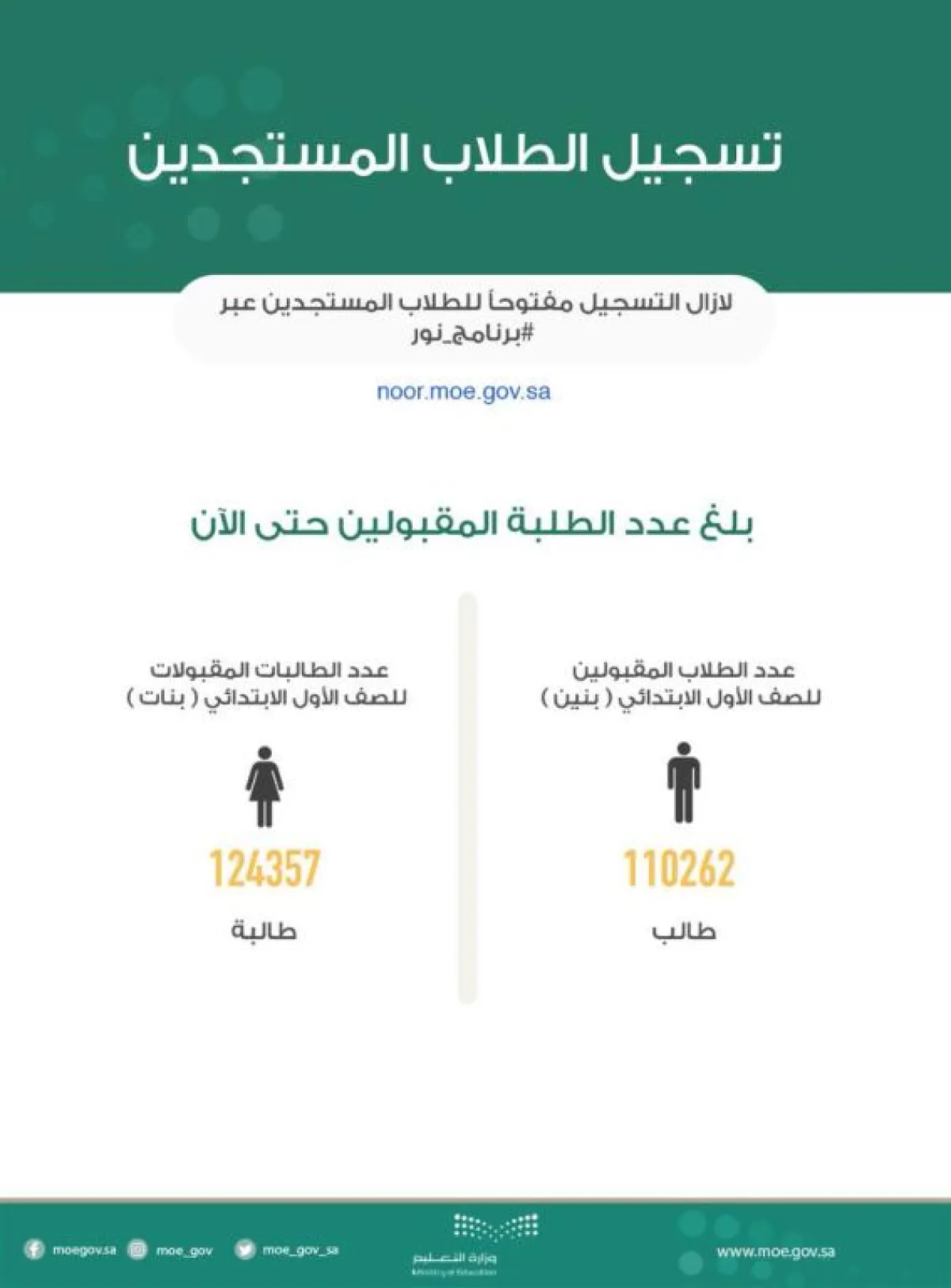 وقالت الوزارة عبر تغريدة لها في حسابها الشخصي بموقع تويتر: "تسجيل الطلاب المستجدين في نظام نور يتجاوز الـ ٥٠%، من المتوقع تسجيلهم في الصف الأول الابتدائي خلال شهرين من تدشين التسجيل. أخي ولي الأمر بادر بالتسجيل المبكر لابنك، أو ابنتك على الرابط التالي: http://noor.moe.gov.sa.