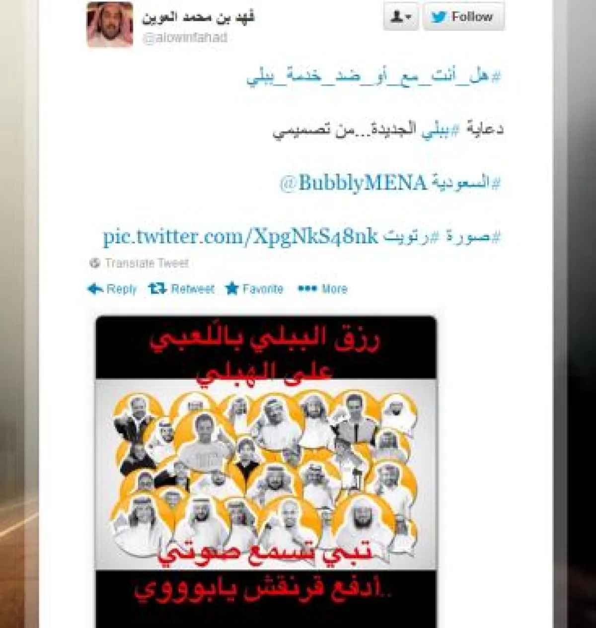 في صف المعارضين تقول هيله المشوح @hailahabdulah "لو لم تكن #ببلي بفلوس ومادخل فيها مشايخ كان المنابر تصدح الآن بـ ((فتنة ببلي))!" تضيف عليها هنآدي ..♥ @k_alm6r وتقول: "غصب يبون يسرقون المواطن، شافوا مافي أمل في قطع الواتساب والفايبر قالوا نجيب خدمه جديدة وراها فلوس".
