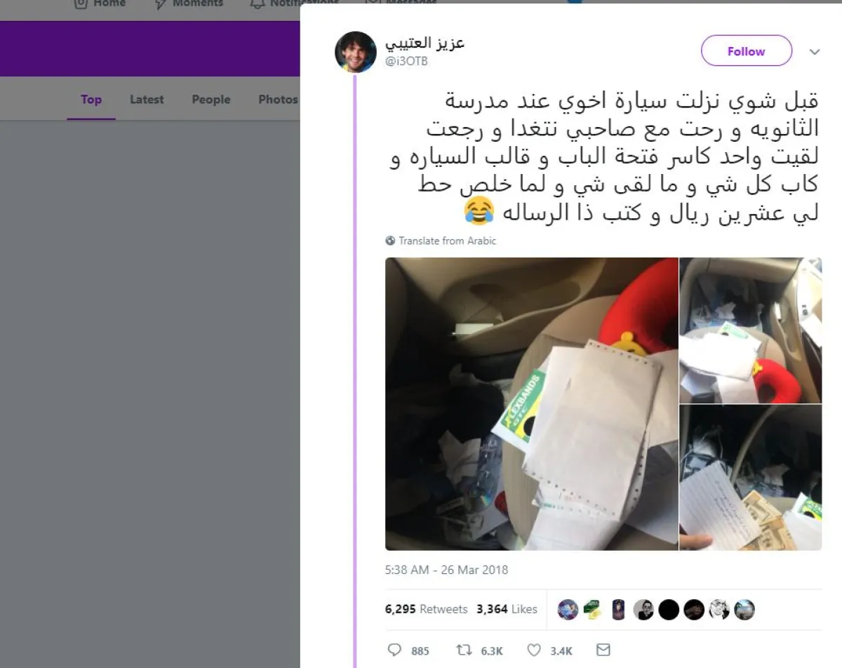 وتداول المغردون هذه الصور على نطاق واسع، ويقول عزيز العتيبي من خلال حسابه على تويتر: "قبل شوي نزلت سيارة أخوي عند مدرسة الثانوية ورحت مع صاحبي نتغدا ورجعت لقيت واحد كاسر فتحة الباب وقالب السيارة وكابّ كل شي وما لقي شي ولما خلص حط لي عشرين ريال وكتب ذا الرسالة".