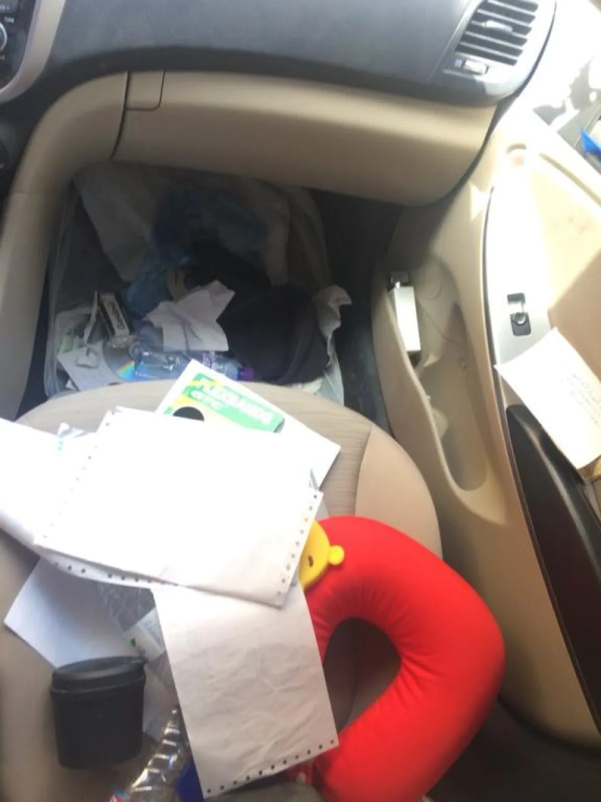 وقام الشخص بتصوير سيارته التي وضح عليها عدم الترتيب ووجود الكثير من الأوراق وعلب الماء الفارغة بجانب الرسالة التي تركت له في السيارة من قبل السارق.
