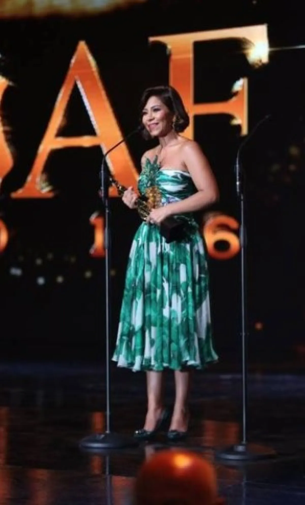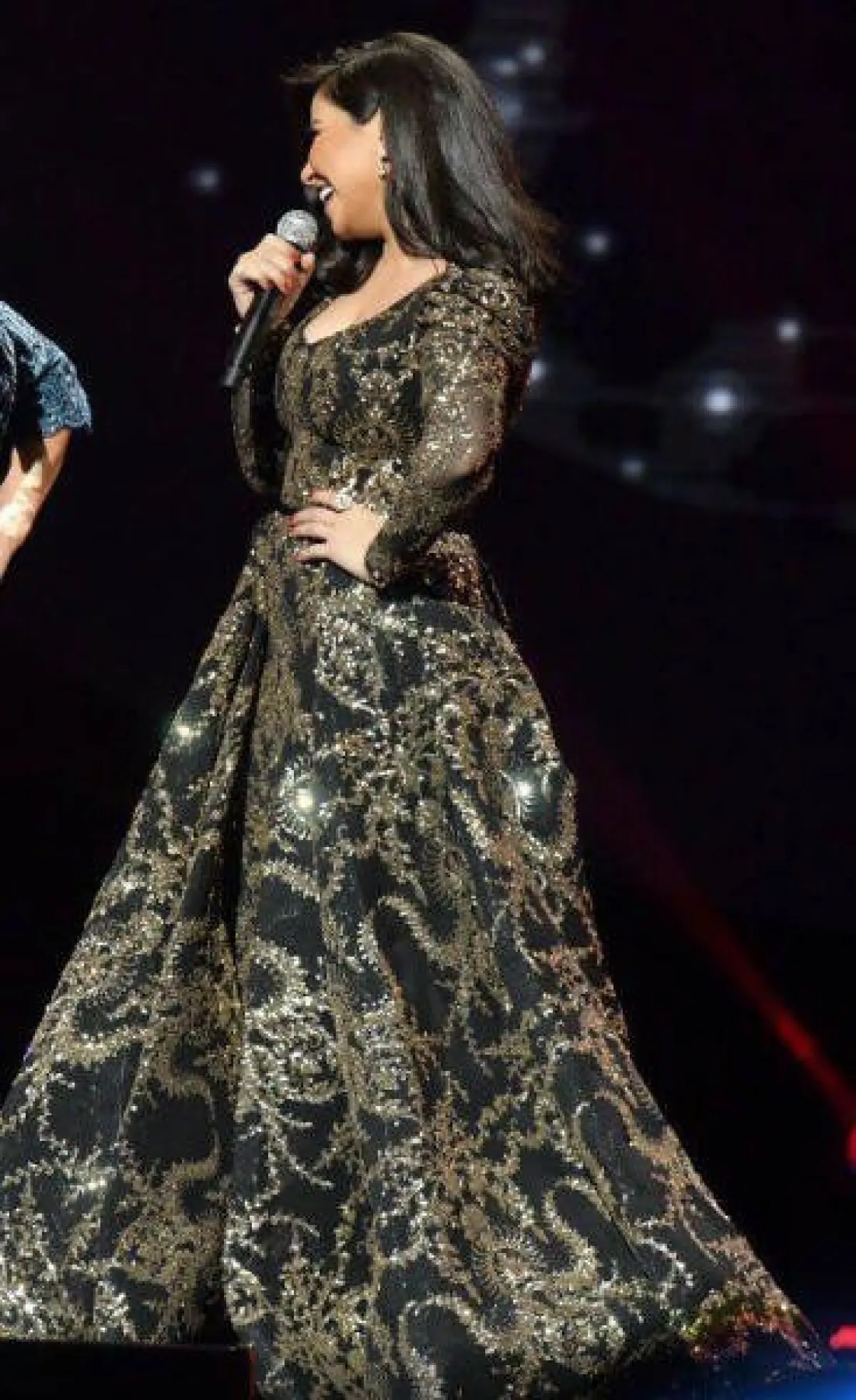 -الفستان المنفوش مع ياقة حرف V من أكثر القصات التي ناسبت قوامها، حيث أخفت عدد الكيلوغرامات الزائدة التي بدت على شيرين في الآونة الأخيرة، ومنحتها طولًا أكبر، فتألقت بتصميم ملوكي من توقيع يوسف الجسمي Yousef Al Jasmi، في حفل "هلا فبراير" 2018.