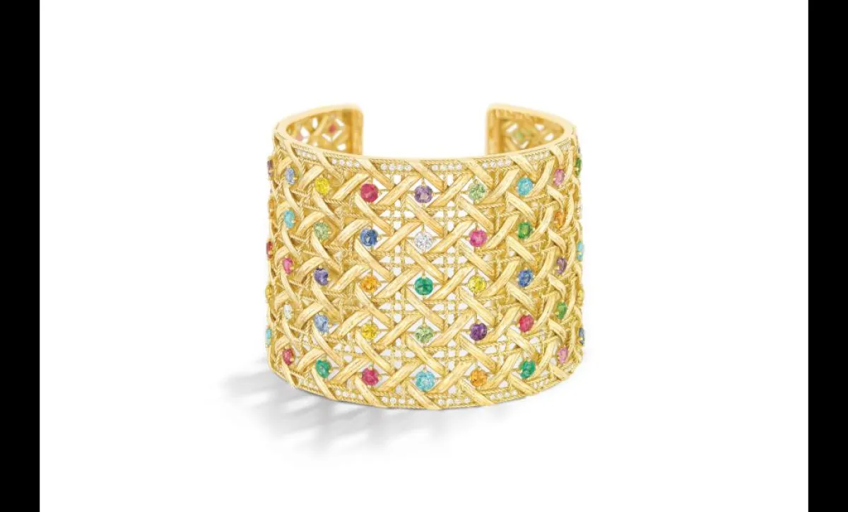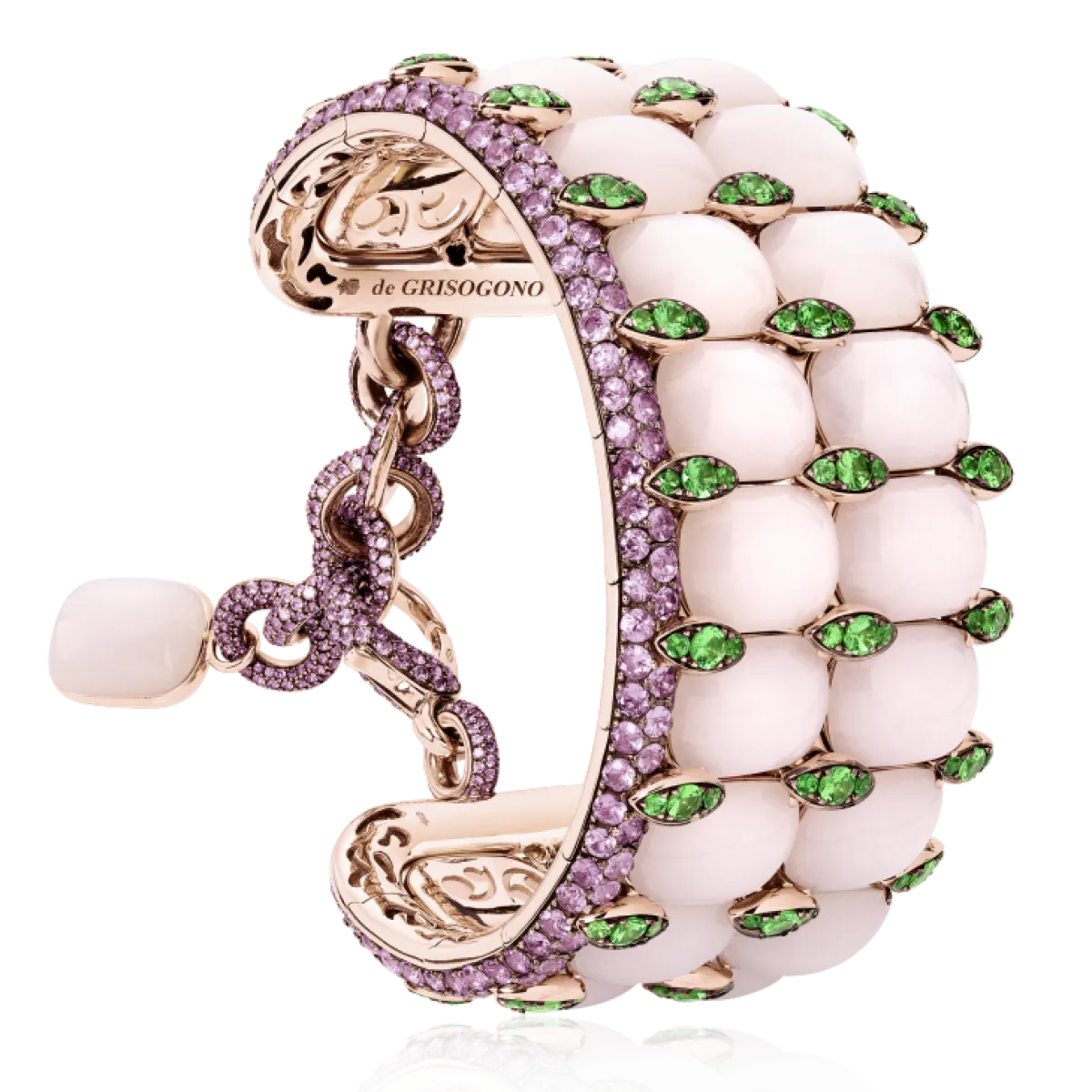 كذلك لفتنا سوار دي غريزوغونو المصنوع من الذهب الوردي والمرصّع بحجر الأوبال والتسافوريت والسافير الزهري، بطريقة فنيّة مبتكرة.