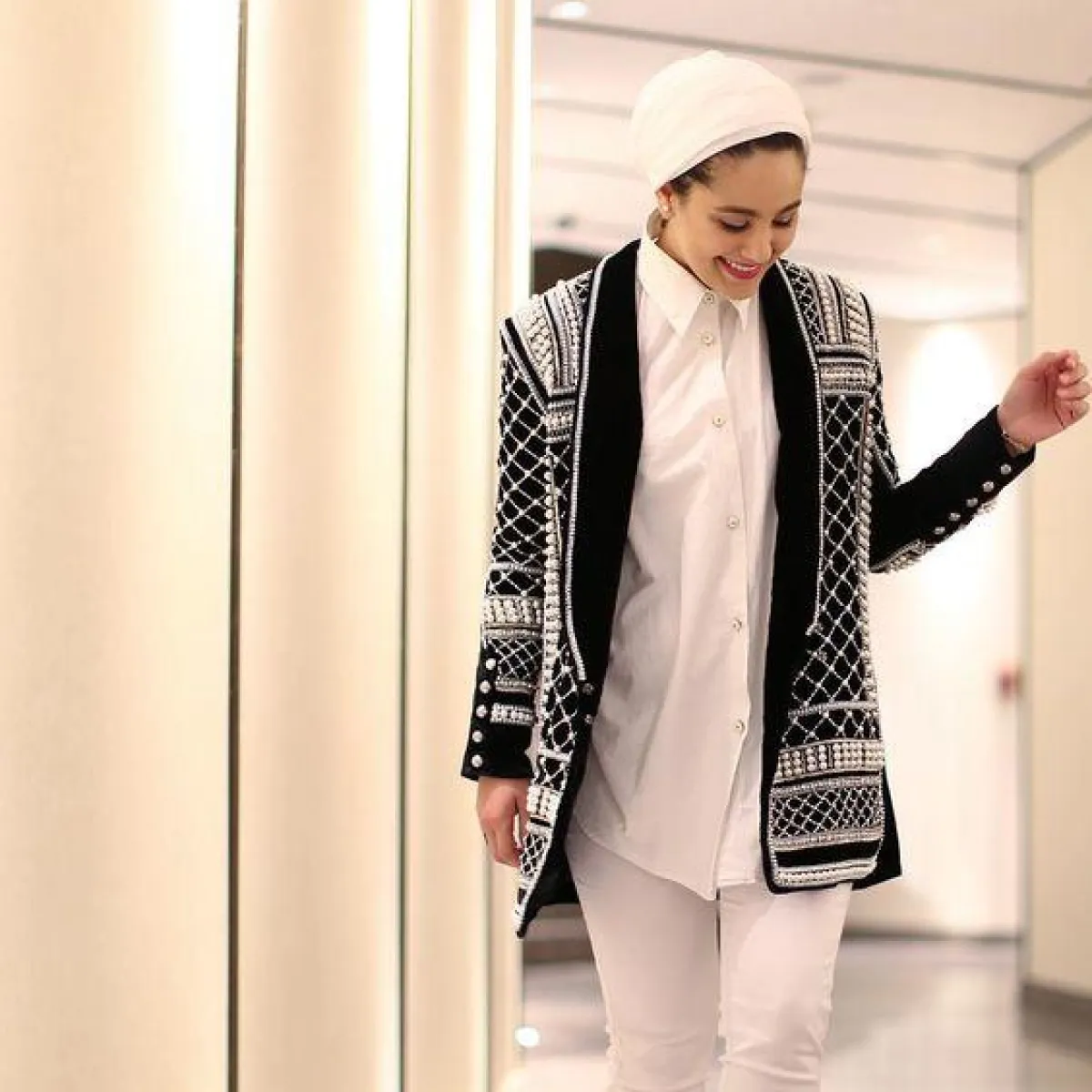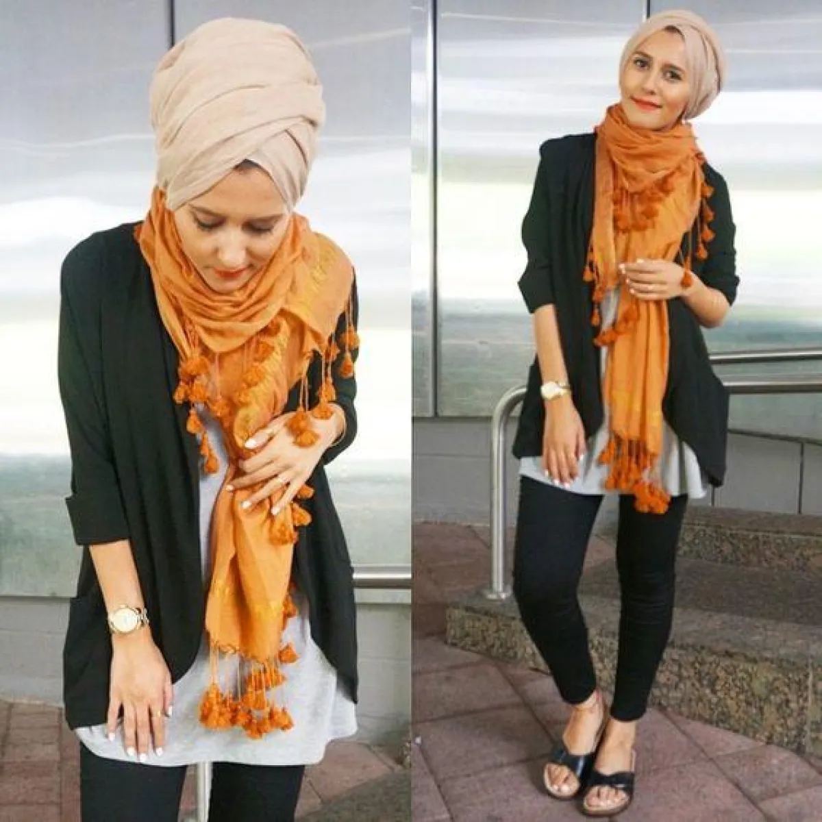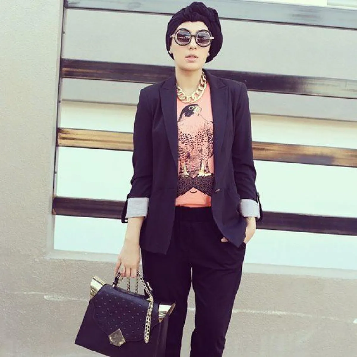 كما اخترنا لك إطلالة دينا طوكيو، بتنسيق البلايزر مع السكارف الأنيق، وتنساب هذه الصيحة السيدات الحوامل، والفتيات صاحبات المقاس الكبير.