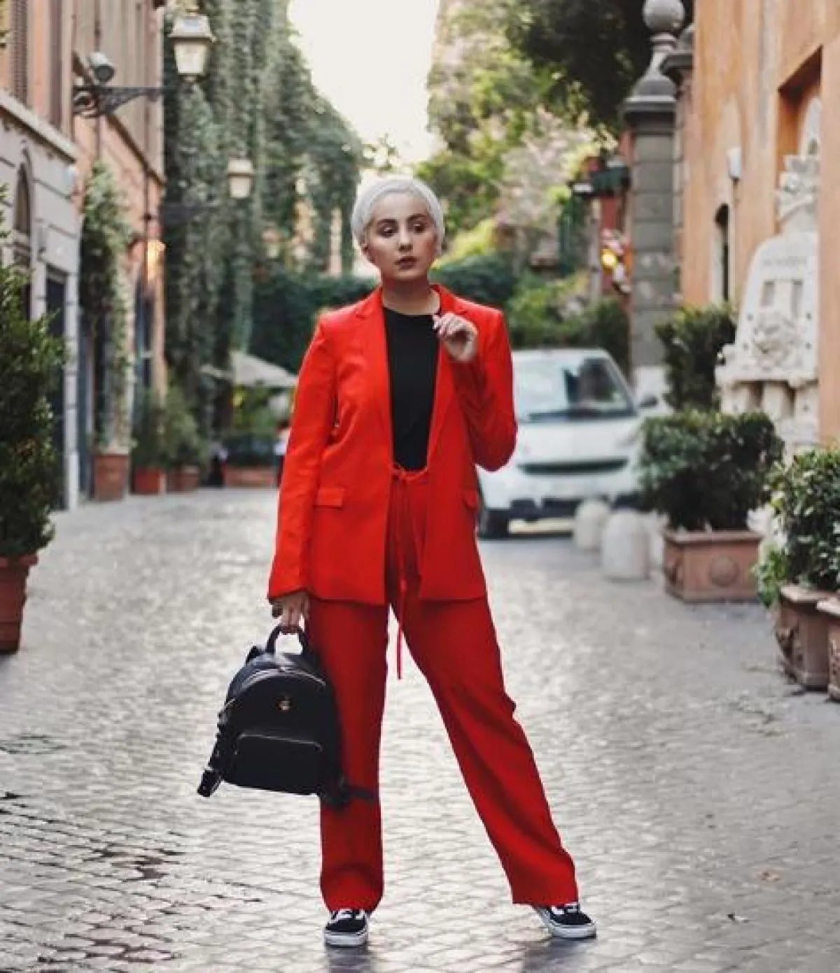 بإمكانك اختيار البلايزر الطويل بارتدائه كبدلة نسائية على طريقة آسيا بارتداء بنطلون بدرجة الأحمر الجريء من نفس لون وخامة البلايزر، وحقيبة ظهر أنيقة صغيرة الحجم، وسنيكرز لإطلالة مريحة.