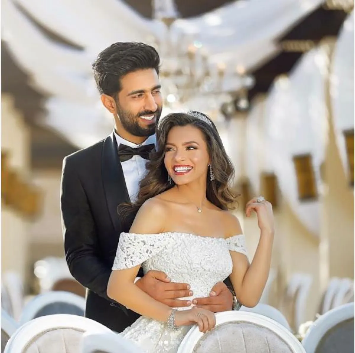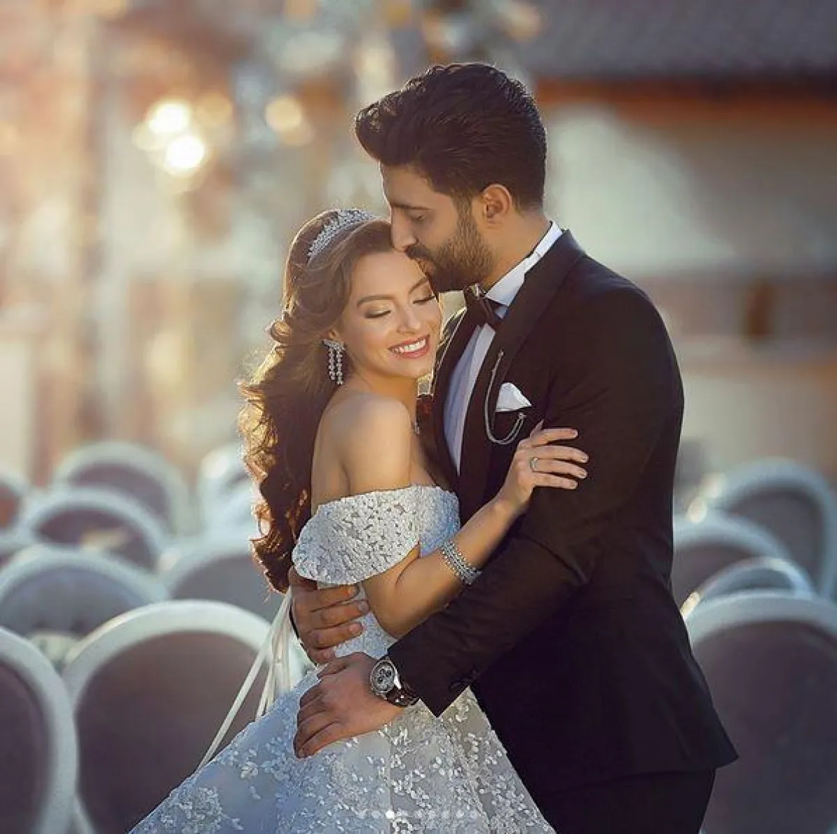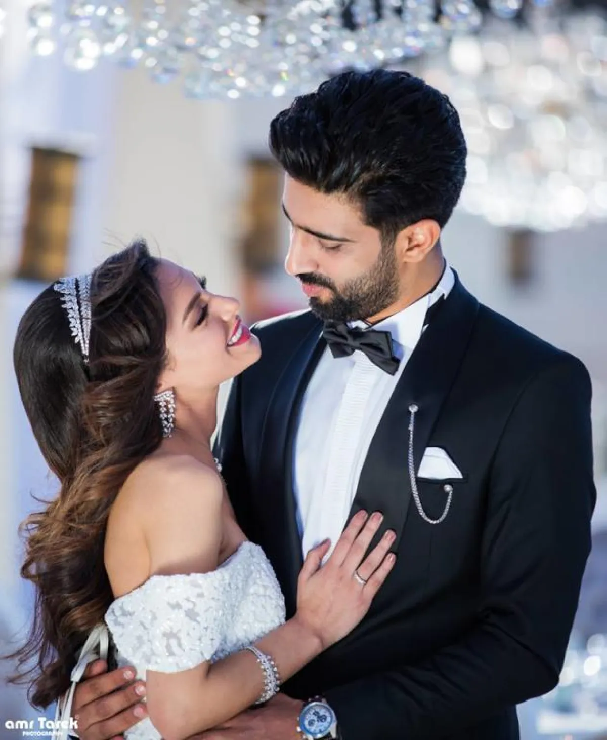 أما عن إطلالة العروس فقد ارتدت فستان زفاف من تصميم الكويتي يوسف الجسمي، وتسريحة الشعر من صالون أسامة درويش، والمكياج بأنامل علاء التونسي.