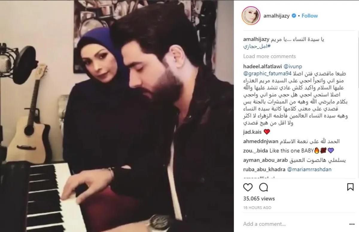 الفنانة أمل حجازي، نشرت عبر حسابها على موقع انستقرام، فيديو لأدائها أغنية "يا سيدة النساء.. يا مريم"، وهي الأغنية الثانية بعد قرارها ارتداء الحجاب، لتؤكد ما صرحت به سابقًا من أنها لن تعتزل الغناء، وإنما ستهجر اللون العاطفي فقط.