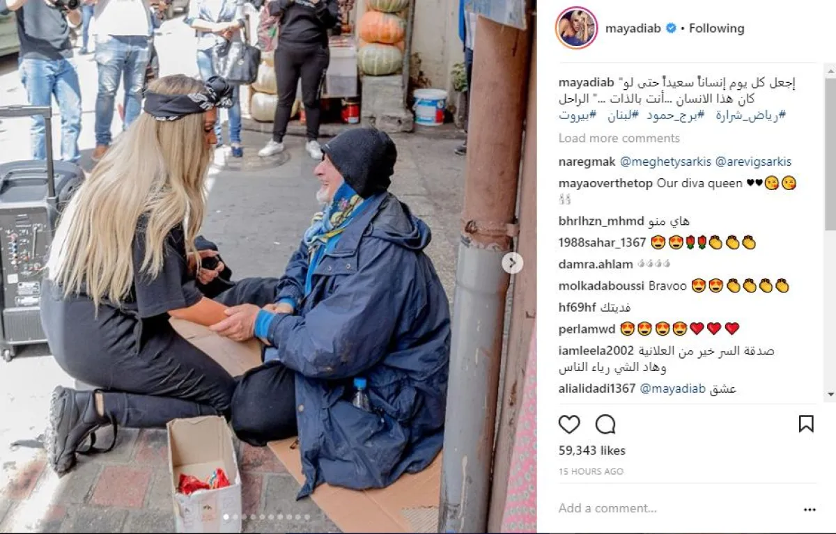 النجمة اللبنانية مايا دياب أطلقت عبر حسابها بموقع انستقرام حملة لمساعدة المشردين في لبنان، وكشفت عن صور عدة لها أثناء وجودها في الشوارع الشعبية برفقة رجل عجوز مشرّد يدعى مخايل، وساعدته بالغناء، على جمع الأموال وعلقت على الصور قائلة: إجعل كل يوم إنسانًا سعيدًا حتى لو كان هذا الإنسان ...أنت بالذات .
