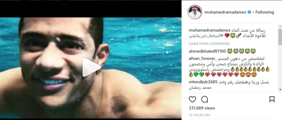 الفنان محمد رمضان نشر مقطع فيديو جديد له عبر حسابه على موقع انستقرام، حيث ظهر وهو يرقص في حمّام سباحة على أنغام آخر أغنياته التي طرحها للدعاية لإحدى شركات الاتصالات وعلّق قائلًا: رسالة من تحت الماء للأخوة الأعداء، الساحة دي بتاعتي.