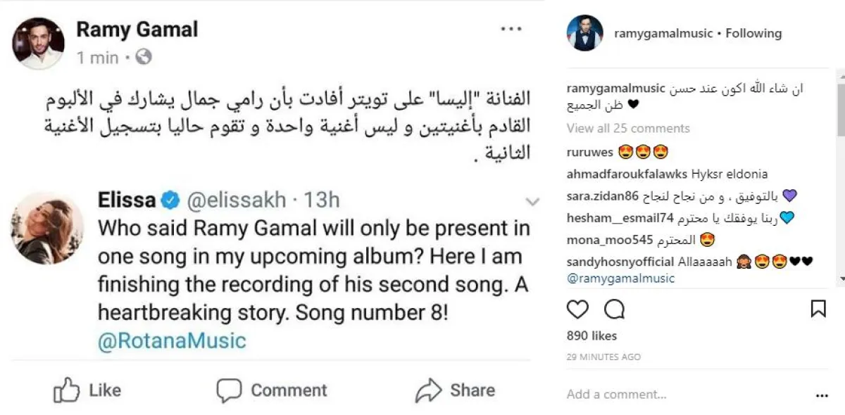 المطرب المصري رامي جمال استعان بالمطربة اللبنانية إليسا، ليؤكد أنه سيشارك بتلحين أغنيتين في ألبومها الجديد، وقام رامي عبر حسابه بموقع انستقرام، بإعادة مشاركة تغريدة لإليسا قالت فيها: من قال إنّ رامي جمال سيشارك بأغنية واحدة فقط في الألبوم الجديد، وقام بالتعليق عليها قائلًا: إن شاء الله أكون عند حسن ظن الجميع .