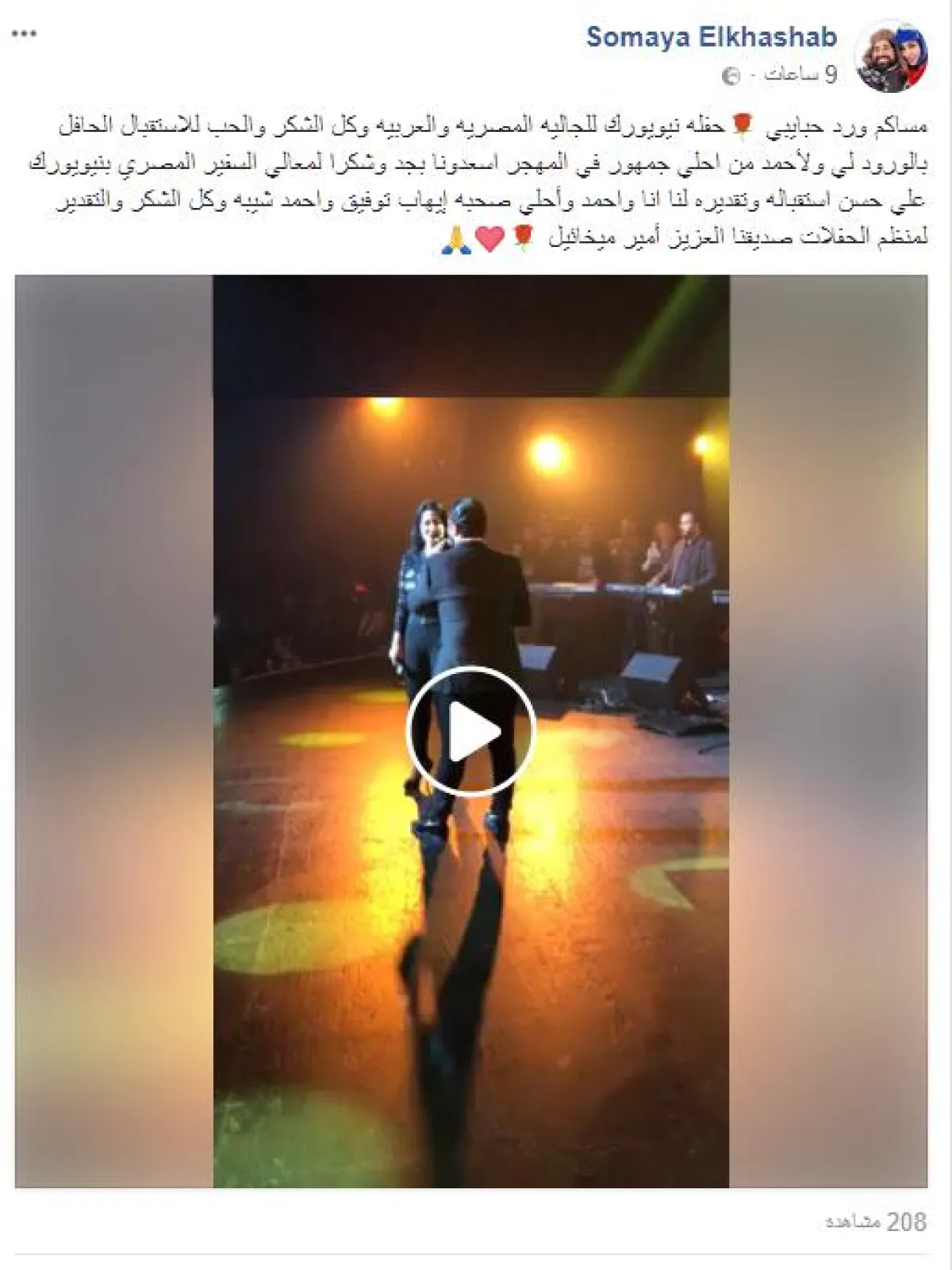 ونشرت الخشاب مقطع فيديو لها وهي تقوم بغناء دويتو "بالحلال يا معلم" إلى جانب زوجها، وعلقت قائلة: مساكم ورد حبايبي، حفلة نيويورك للجالية المصرية والعربية وكل الشكر والحب للاستقبال الحافل بالورود لي ولأحمد، من أحلى جمهور في المهجر، أسعدونا بجد وشكرًا لمعالي السفير المصري بنيويورك على حسن استقباله وتقديره لنا، أنا وأحمد وأحلى صحبة إيهاب توفيق وأحمد شيبة، وكل الشكر والتقدير لمنظم الحفلات صديقنا العزيز أمير ميخائيل.