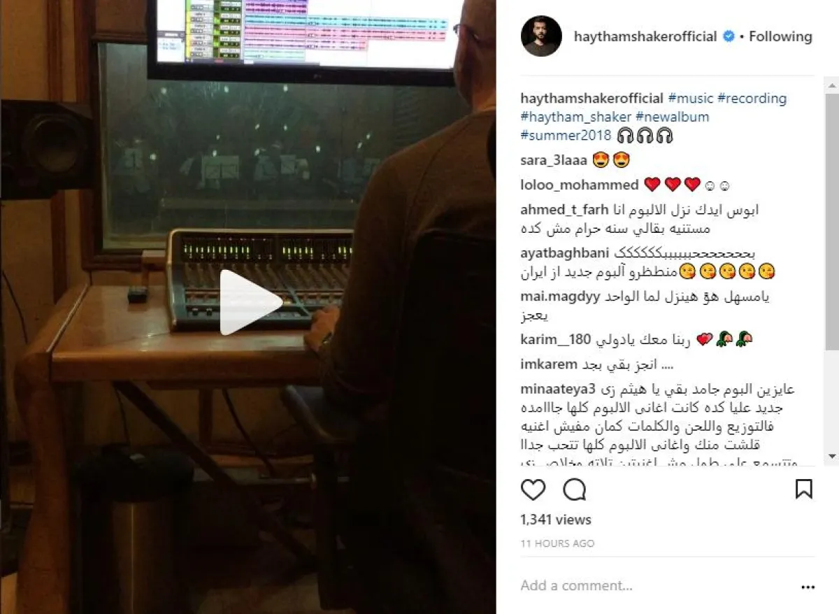 المطرب هيثم شاكر شارك جمهوره عبر موقع انستقرام تفاصيل اللمسات النهائية على أغاني ألبومه الجديد، والذي من المفترض أن يطرحه فى موسم الصيف المقبل، ونشر مقطعًا صغيرًا من إحدى أغنيات الألبوم وعلق عليها قائلًا: الألبوم الجديد الصيف المقبل.