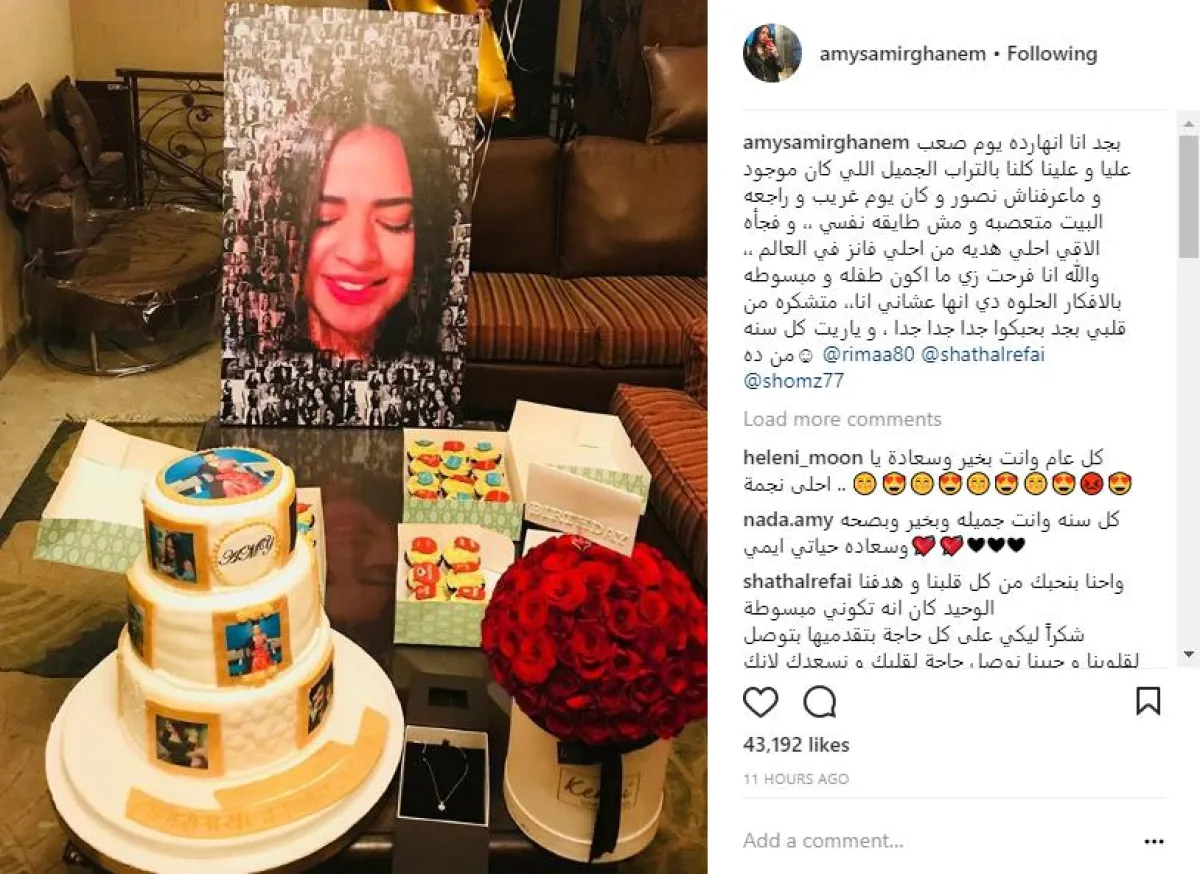 إيمي نشرت صورة لها مع الهدايا عبر حسابها بموقع انستقرام، وعلقت قائلة: بجد انا النهارده يوم صعب عليّا، وعلينا كلنا بالتراب الجميل اللي كان موجود وماعرفناش نصوّر، وكان يوم غريب وراجعة البيت متعصبة ومش طايقة نفسي، وفجأه ألاقي أحلى هدية من أحلى فانز في العالم.