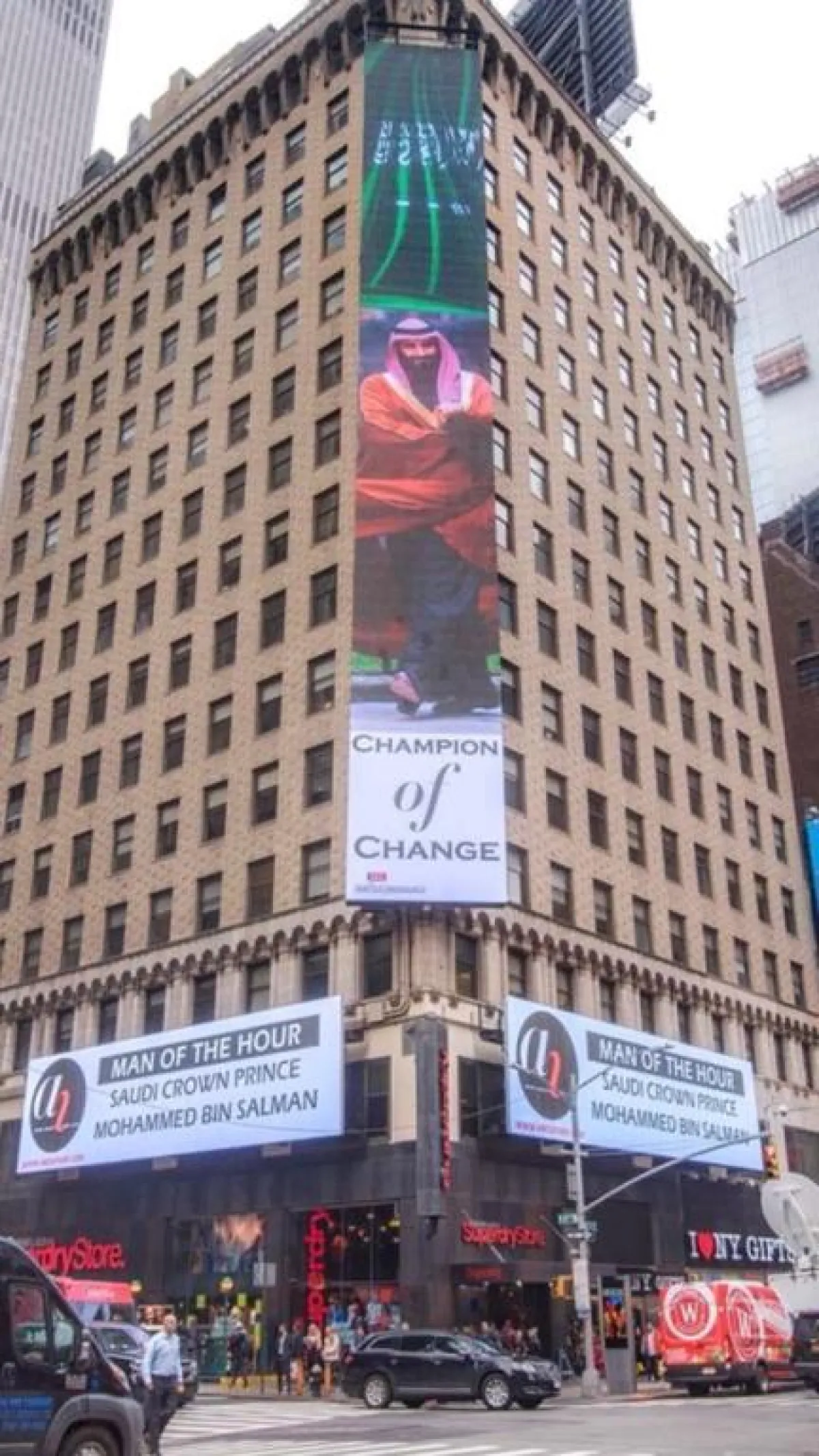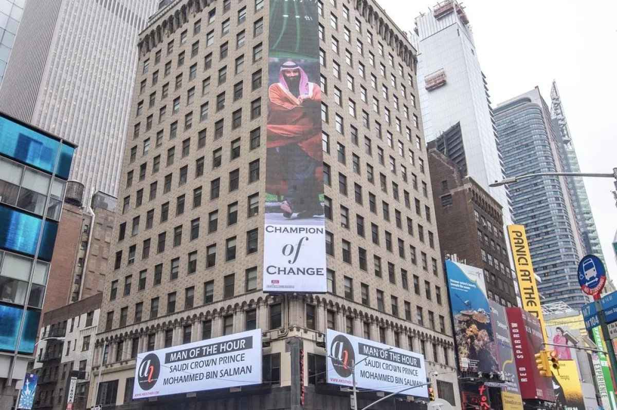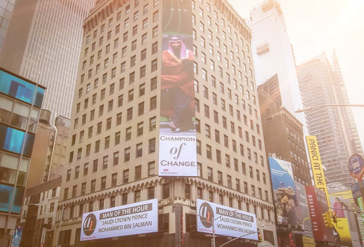 بمناسبة زيارة ولي العهد لمدينة نيويورك ضمن إطار جولته الأميركية أضيئت ساحة Times Square الشهيرة بلوحة عملاقة للأمير محمد بن سلمان، حملت عنوان بطل التغيير The Champion Of Change بمبادرة من موقع About Her الذي واكب هذه الزيارة منذ بدايتها، مثمّناً مواقف وقرارات الأمير في مسار التغيير والتقدّم وما يتوقّع أن ينجم عن جولته الأميركيّة من نتائج تصبّ في صالح التنمية الاقتصاديّة والتكنولوجيّة وغيرها من المجالات.