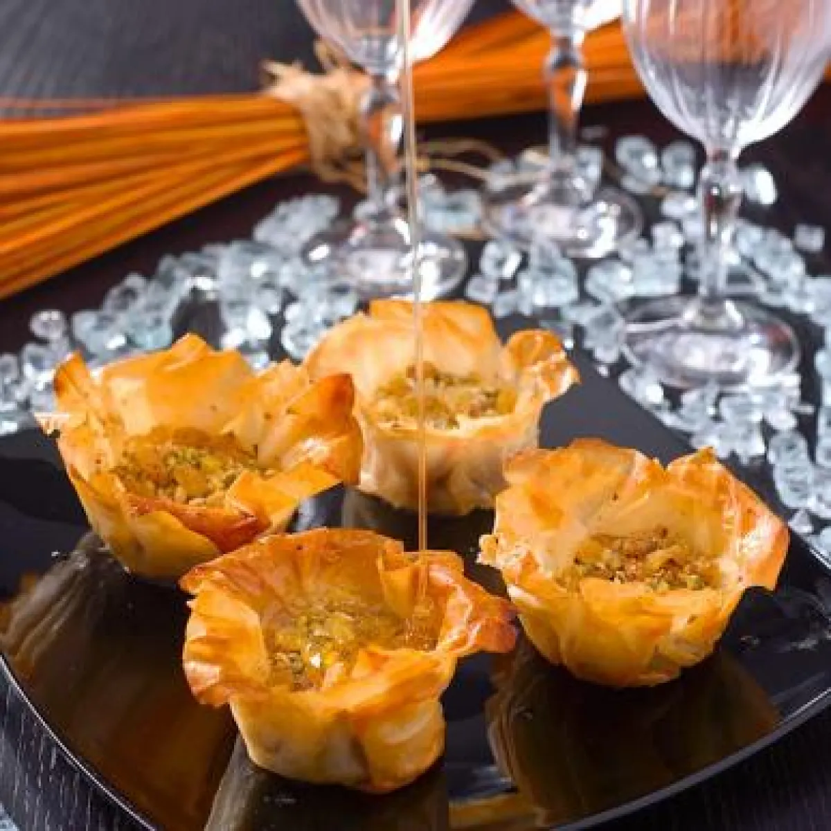 6-يتم إخراجها من الفرن، وتضاف ملعقة كبيرة من القطر البارد فوق كل قالب صغير، ويزيّن بالبندق في وسطه.
