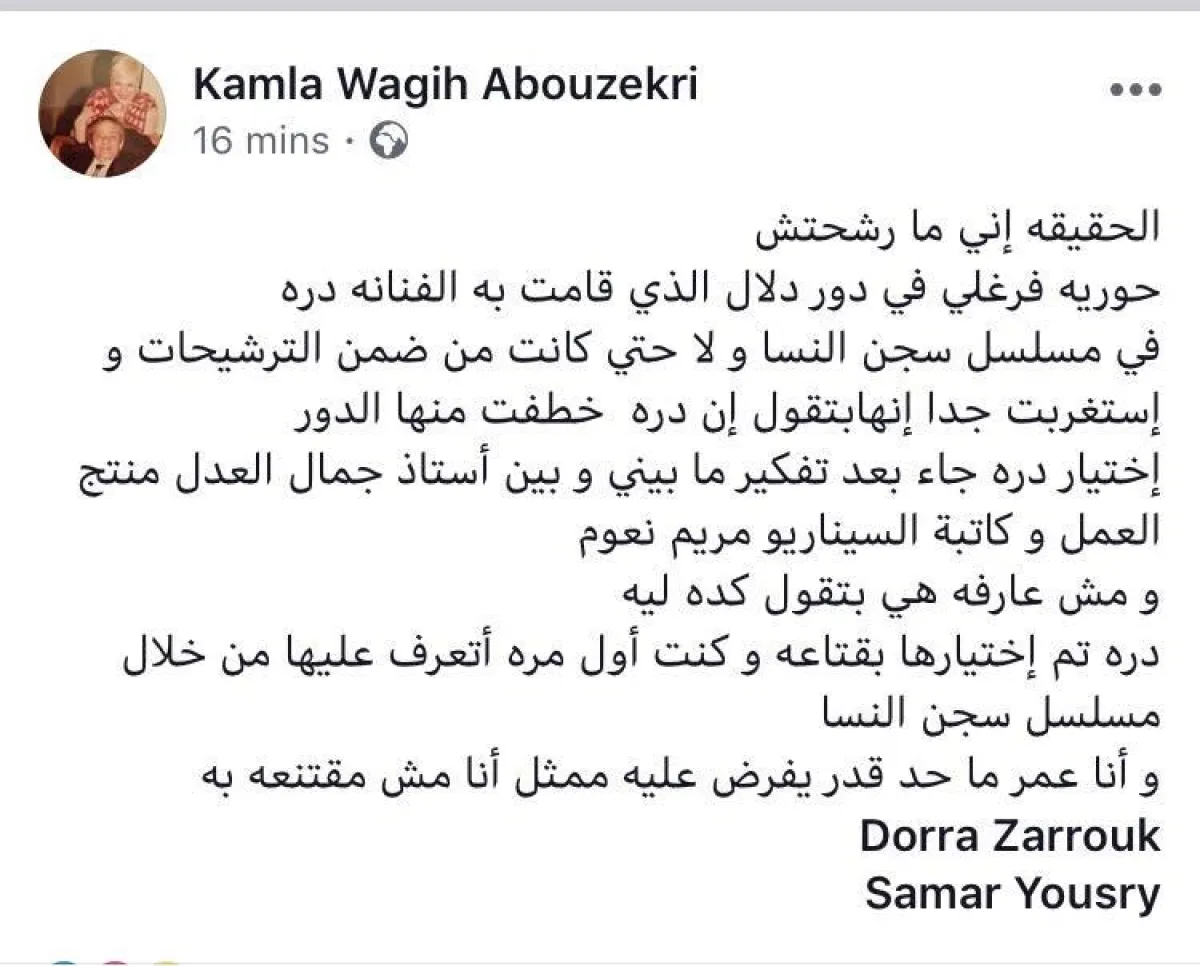 من جانبها نفت المخرجة كاملة أبو ذكرى ما قالته حورية في منشور لها على موقع التواصل الاجتماعي فيس بوك قائلة :" الحقيقه إني ما رشحتش حوريه فرغلي في دور دلال الذي قامت به الفنانه درة، في مسلسل سجن النسا و لا حتى كانت من ضمن الترشيحات و استغربت جداً إنها بتقول إن دره خطفت منها الدور وأضافت :" إختيار دره جاء بعد تفكير ما بيني و بين أستاذ جمال العدل منتج العمل و كاتبة السيناريو مريم نعوم.. ومش عارفه هي بتقول كده ليه، واختتمت حديثها قائلة :" دره تم إختيارها بقناعه و كنت أول مره أتعرف عليها من خلال مسلسل سجن النسا".