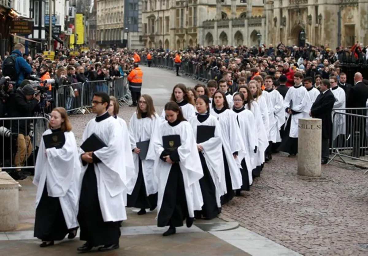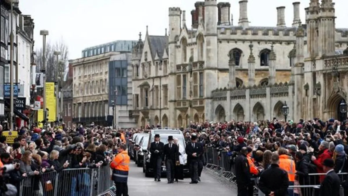واحتشد حوالي 500 ضيف مدعو لحضور الجنازة الخاصة بالعالم البريطاني الشهير «هوكينغ»، وجاء حشد منهم إلى كنيسة سانت ماري الكبرى الخاصة بالجامعة في مدينة كامبريدج الإنجليزية لحضور القداس، الذي يقام تكريماً لـ«هوكينغ»، الذي توفي في الرابع عشر من مارس / آذار عن عمر ناهز 76 عاماً.