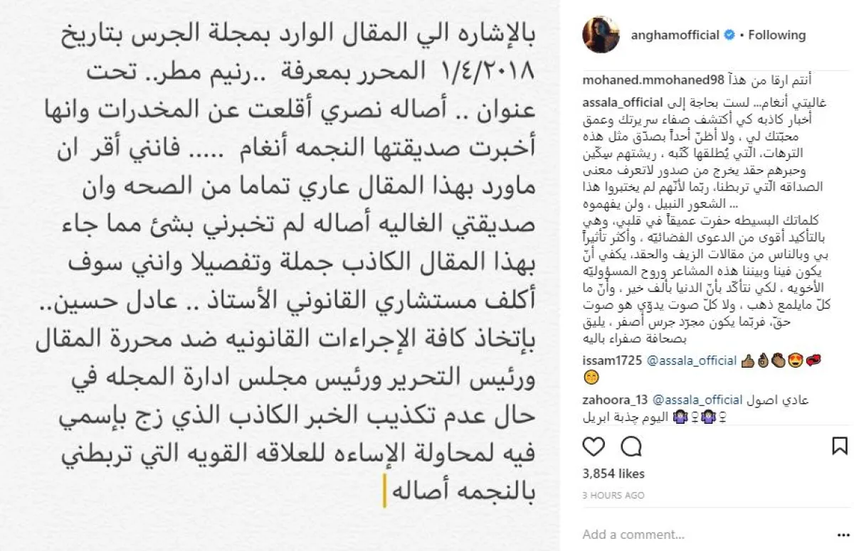 أنغام فوجئت بالأمس بنشر تقرير صحافي يؤكد أنها على علم برحلة تعافي أصالة من إدمان المخدرات، ورغم أنّ الجميع توقّع أنّ الخبر بأكمله "كذبة أبريل"، لكنّ أنغام تعاملت معه بجدية، ونشرت تكذيبًا عبر حسابها بتويتر وأعادت نشره عبر حسابها الرسمي بموقع انستقرام قائلة: بالإشارة إلى المقال الوارد بإحدى المجلات، تحت عنوان: "أصالة نصري أقلعت عن المخدرات وأخبرت صديقتها النجمة أنغام"، فإنني أقر أنّ ما ورد بهذا المقال عارٍ تمامًا من الصحة، وأنّ صديقتي الغالية أصالة لم تخبرني بشيء مما جاء بهذا المقال الكاذب جملة وتفصيلًا.