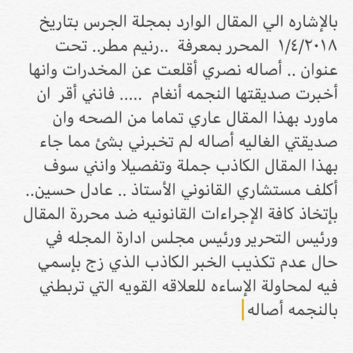 أضافت: وإنني سوف أكلف مستشاري القانوني، باتخاذ الإجراءات القانونية كافة، ضد محررة المقال، ورئيس التحرير، ورئيس مجلس إدارة المجلة، في حال عدم تكذيب الخبر الذي زج باسمي فيه، لمحاولة الإساءة للعلاقة القوية التي تربطني بالنجمة أصالة.