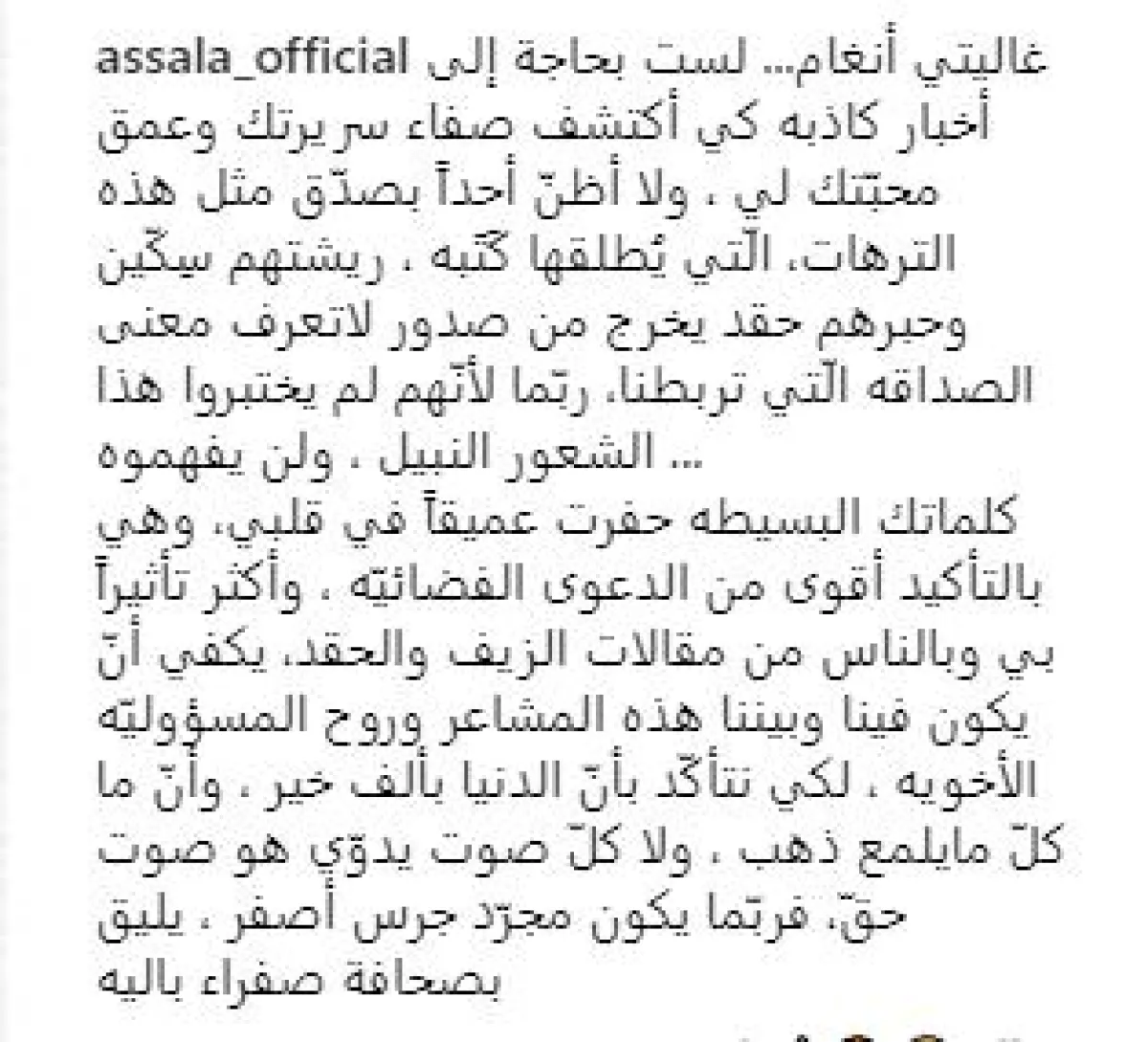 تابعت أصالة قائلة: كلماتك البسيطة حفرت عميقًا في قلبي، وهي بالتأكيد أقوى من الدعوى القضائية ، وأكثر تأثيرًا بي وبالناس من مقالات الزيف والحقد، يكفي أن يكون فينا وبيننا هذه المشاعر وروح المسؤولية الأخوية ، لكي نتأكد بأنّ الدنيا بألف خير ، وأنّ ما كلّ ما يلمع ذهب ، ولا كلّ صوت يدوي هو صوت حقّ، فربما يكون مجرد جرس أصفر ، يليق بصحافة صفراء بالية.