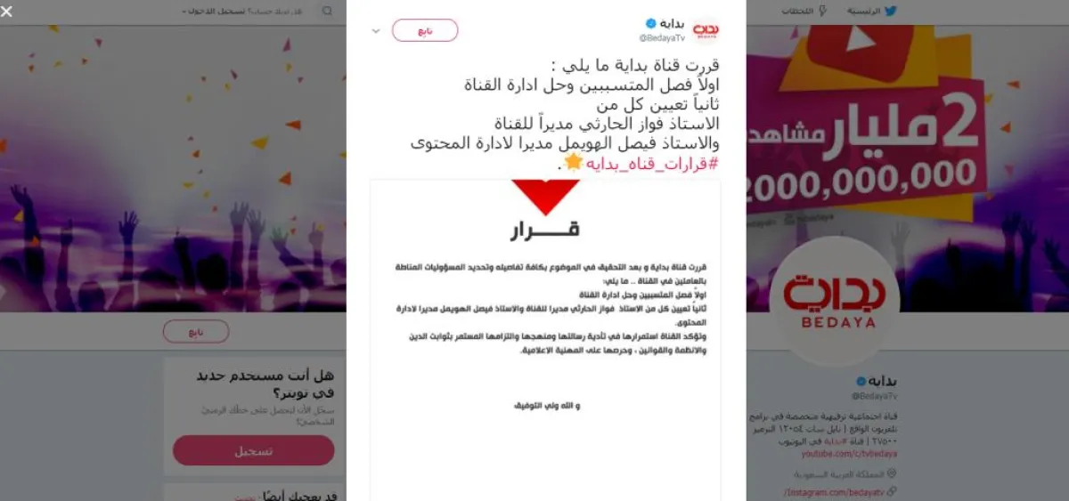 ‏‫وقالت القناة في بيان إلحاقي: "قررت قناة بداية، وبعد التحقيق في الموضوع بكافة تفاصيله، وتحديد المسؤوليات المنوطة بالعاملين في القناة ما يلي: فصل المتسببين، وحل إدارة القناة، وتعيين كلٍّ من الأستاذ فواز الحارثي مديراً للقناة، والأستاذ فيصل الهويمل مديراً لإدارة المحتوى".‬