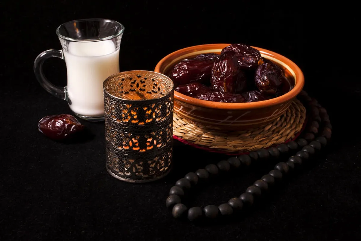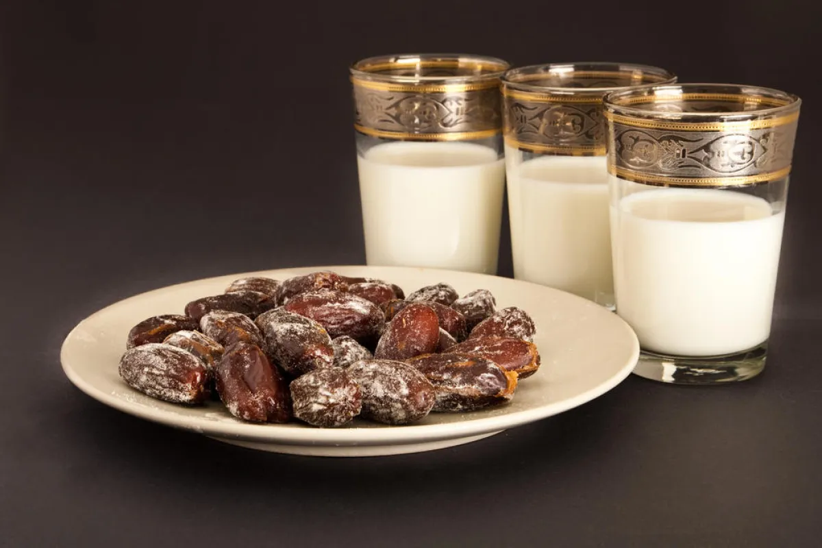 الفطور: 7 حبات من التمر، مع كوب من اللبن.