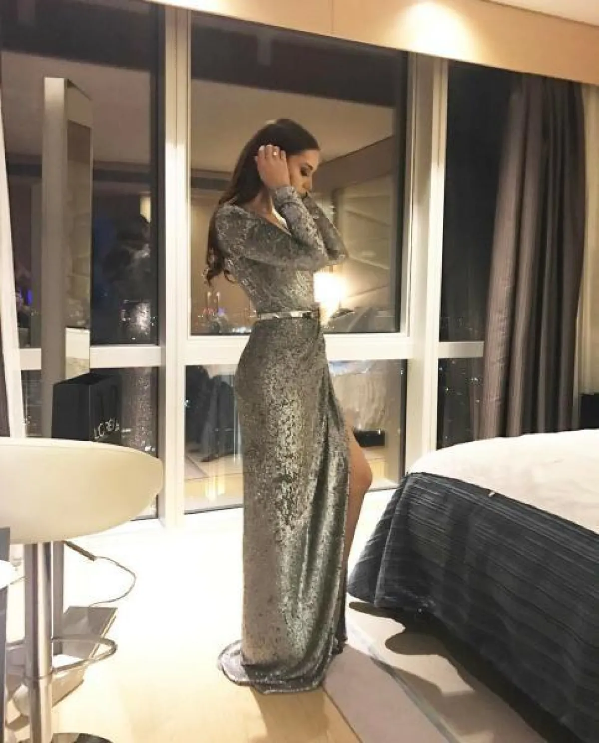 فهرية بفستان فضي مزين بشق على الجانب