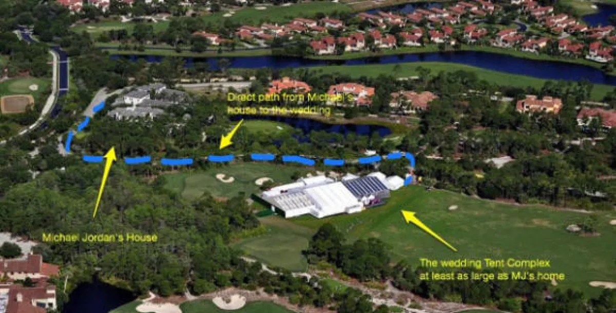 وأشار إلى أن Michael Jordan حفلاً مميزاً في عقاره الضخم الذي يملكه بفلوريدا من خلال نصبه أكبر خيمة في تاريخ الأعراس، حيث بلغت مساحتها 40ألف مربع، وذلك بعد مراسم الزفاف التي أقيمت في الكنيسة الأسقفية ببالم بيتش.