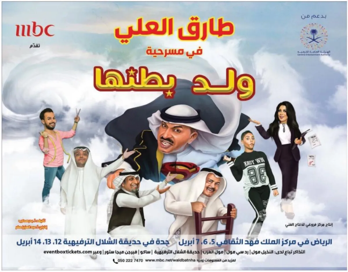 انطلاقًا للفعاليات الترفيهية والتي تأتي بدعم من الهيئة العامة للترفيه، يبدأ غدًا عرض المسرحية الفكاهية لنجم المسرح طارق العلي "ولد بطنها"، والتي تقدمها MBC في مركز الملك فهد الثقافي بالرياض، من بطولة عبد الرحمن العقل، خالد العجيرم، مي عبد الله، خالد مظفر، وحشد من نجوم الكوميديا، ومن إخراج عبد العزيز صفر، وتأليف بدر محارب وإشراف عيسى العلوي.