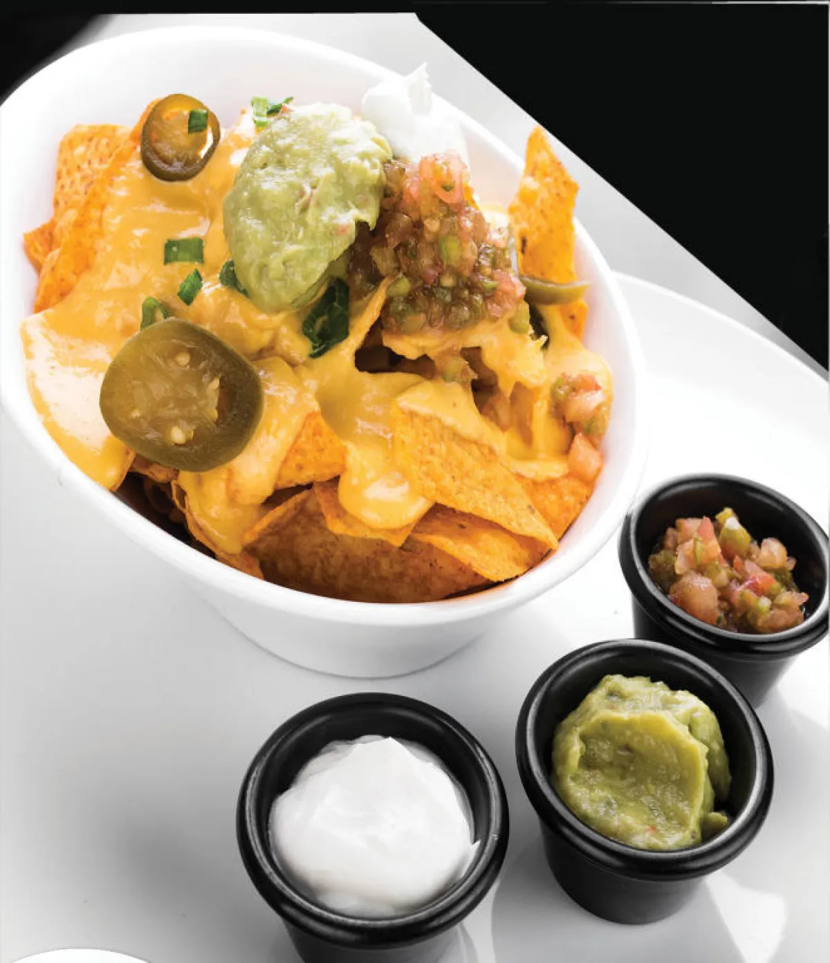 1. انثري الشيبس في أطباق التقديم، وضعي فوقه قطع الطماطم والبصل والفلفل والهالبينو.
