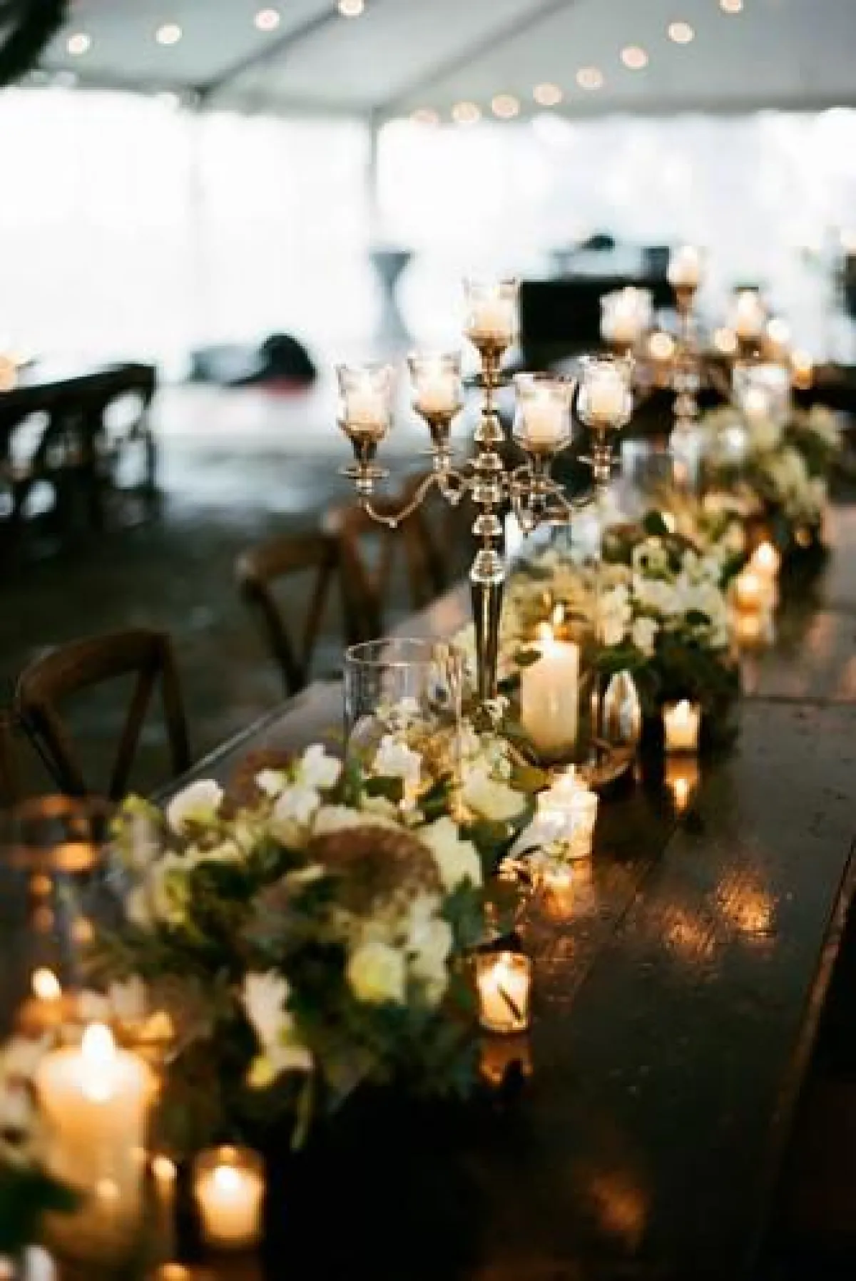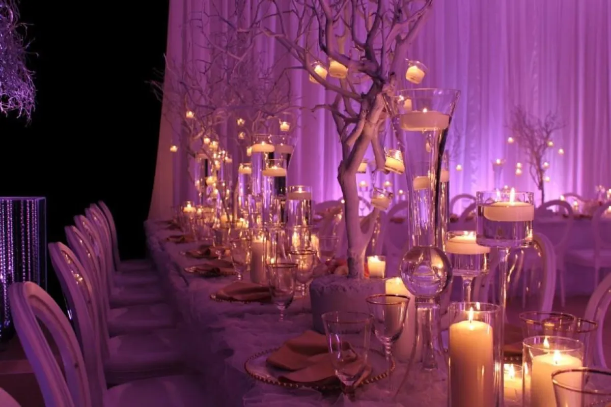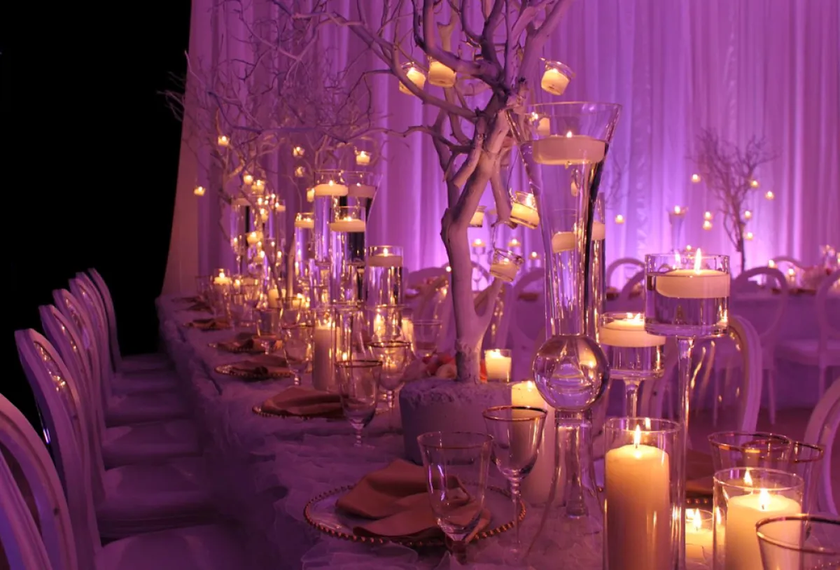 أضواء الشموع تضفي أجواء دافئة في القاعة، خاصًة إذا تم دمجها مع الزهور النرجسية، يمكنك اعتماد هذ الديكور لمناسبات الشتاء، واختيار ورود بألوان زهرية وبيضاء إذا كان فرحك بالصيف.