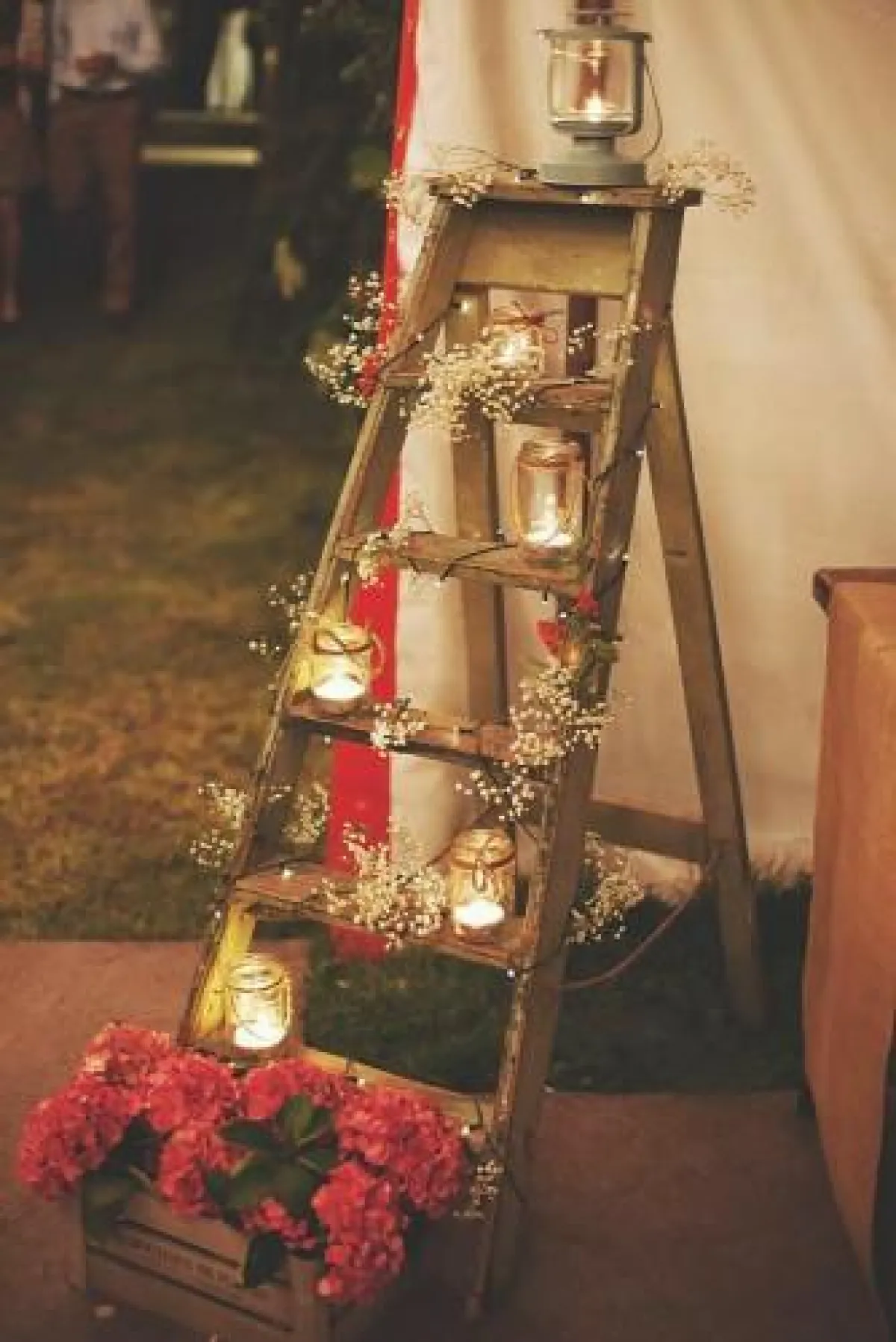 الفوانيس وألواح الأخشاب هي الأنسب لوضع الشموع على الأرض، على جانبي مدخل مكان العرس، بإمكانك وضع الزرع الأخضر بجانبيها لكسر اللون، واندماج الأصفر مع الذهبي.