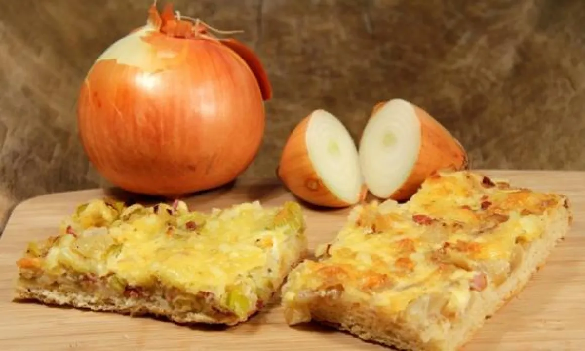 ويُدهن القالب المُستخدم بقليل من الزيت ويُفرد العجين مع الضغط عليه باليد حتى يأخذ شكل القالب (مع التخلص من العجين الزائد على أطراف القالب وإعادة استخدامه).ويتم عمل بعض الثقوب بواسطة شوكة في العجين، ثم يُصب حشو البصل حتى يملأ القالب.