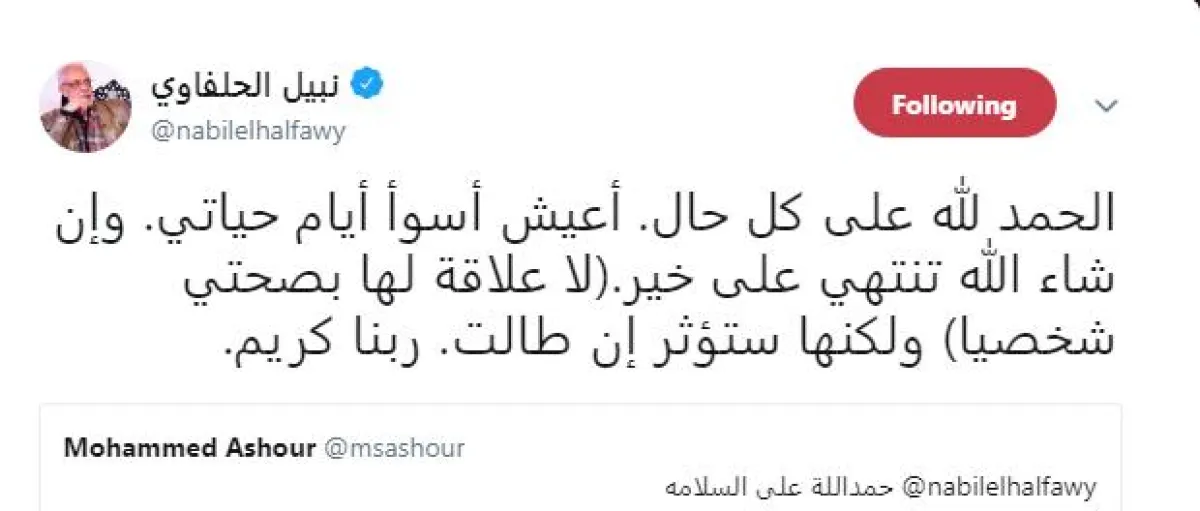 ونشر الحلفاوي، تدوينة عبر تويتر كتب فيها: "الحمد لله على كل حال، أعيش أسوأ أيام حياتي، وإن شاء الله تنتهي على خير، لا علاقة لها بصحتي شخصيًّا، ولكنها ستؤثّر إن طالت، ربّنا كريم".