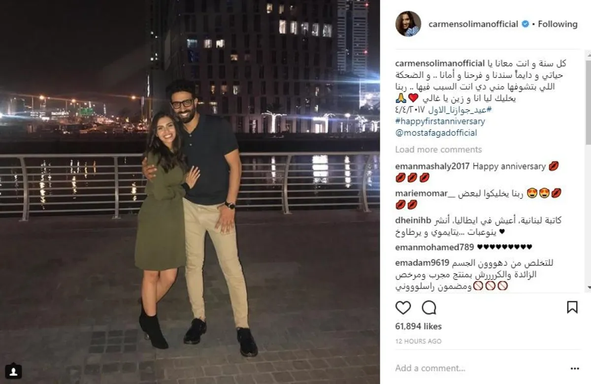 المطربة كارمن سليمان احتفلت بعيد زواجها الأول مع الملحن مصطفى جاد، ومنحته كالعادة رسالة رومانسية جدًّا قالت فيها: كل سنة وانت معانا يا حياتي، ودايمًا سندنا وفرحِنا وأماننا .. والضحكة اللي بتشوفها مني دي إنت السبب فيها .. ربّنا يخليك ليّا أنا وزين يا غالي.