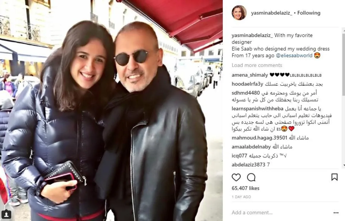 الفنانة المصرية ياسمين عبد العزيز قررت الرد على اتهامها باقتباس اطلالة المطربة اللبنانية إليسا، بفستان من تصميم إيلي صعب، ولكن بطريقة غير مباشرة، فنشرت صورة لها مع المصمم اللبناني المعروف عبر حسابها بموقع انستقرام، وعلقت عليها مؤكدة أنه مصمّم فستان زفافها منذ 17 عامًا.