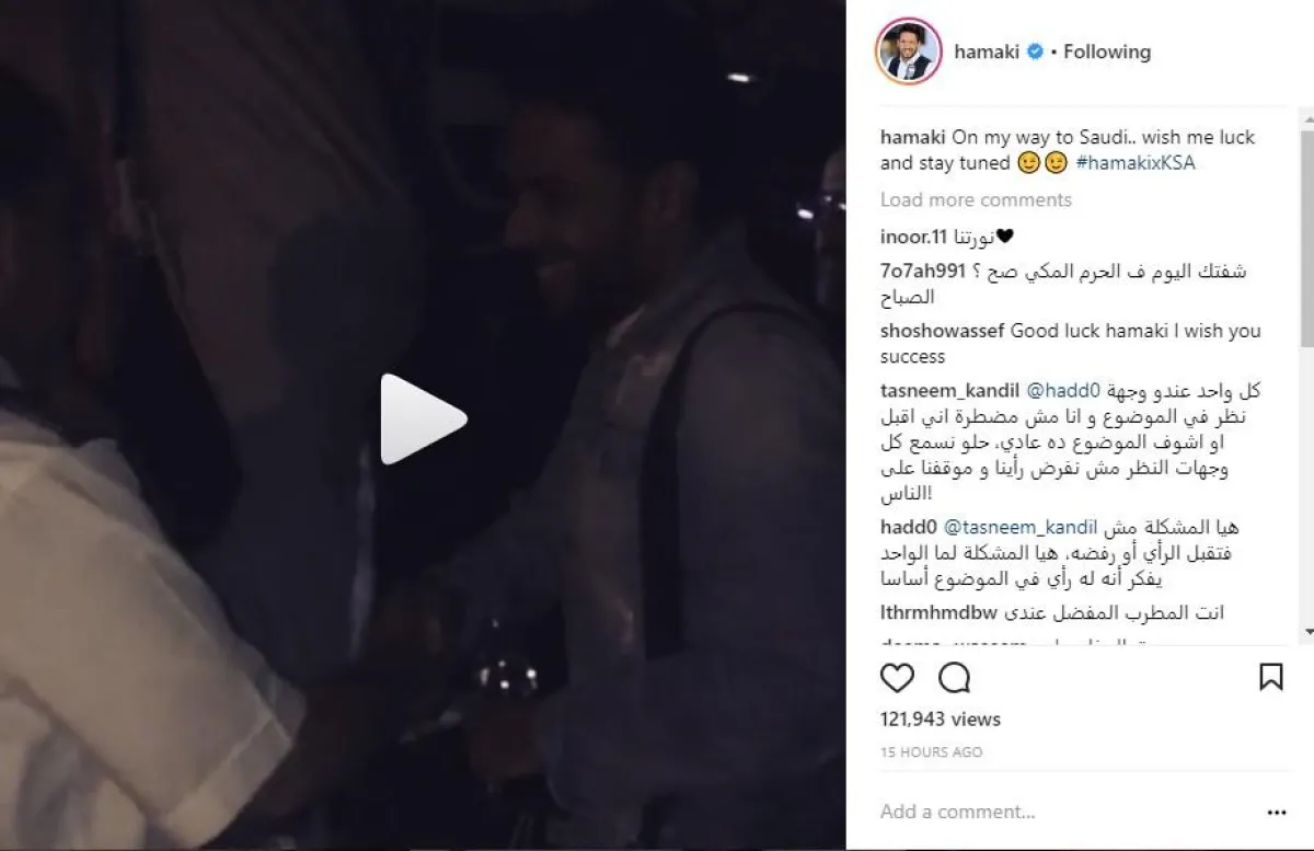 حماقي شارك جمهوره أيضًا عبر حسابه بموقع انستقرام، لقطات من ركوبه الطائرة متّجهًا إلى المملكة، لإقامة أول حفل غنائي له في السعودية غدًا الجمعة.