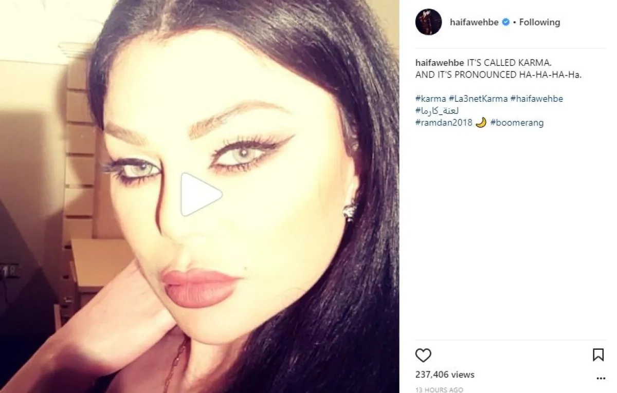 النجمة اللبنانية هيفاء وهبي نشرت عبر صفحتها الشخصية على موقع انستقرام، مقطع فيديو قصيرًا من كواليس تصوير مسلسل "لعنة الكارما"، مازحت خلاله متابعيها، وأغلقت باب التعليقات كالعادة، علمًا بأنّ هيفاء عانت في الأيام الماضية تشكيك الجمهور في قدرتها على إنجاز المسلسل بالوقت القصير المتبقي على بدء الشهر الفضيل.